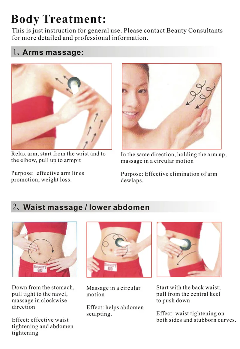 Это просто Инструкция для общего использования. Для получения более подробной и профессиональной информации обратитесь к специалистам по салону красоты. 1. Массаж рук: Расслабьте руку, начните с запястья и в том же направлении, удерживая руку вверх, локоть, потяните до массажа подмышек круговым движением Назначение: эффективное назначение линий: эффективное устранение промотирования рук, потеря веса. Dewlaps. 2. Массаж талии/нижняя часть живота Вниз от желудка, массаж в круговой старт с задней талией; Тянуть плотно к пупу, движение тянуть от центрального киля массаж по часовой стрелке, чтобы толкать вниз направление эффект: помогает живот Лепки. Эффект: подтяжка талии Эффект: эффективная талия с обеих сторон и упрямые изгибы. Затягивание и Подтяжка живота.