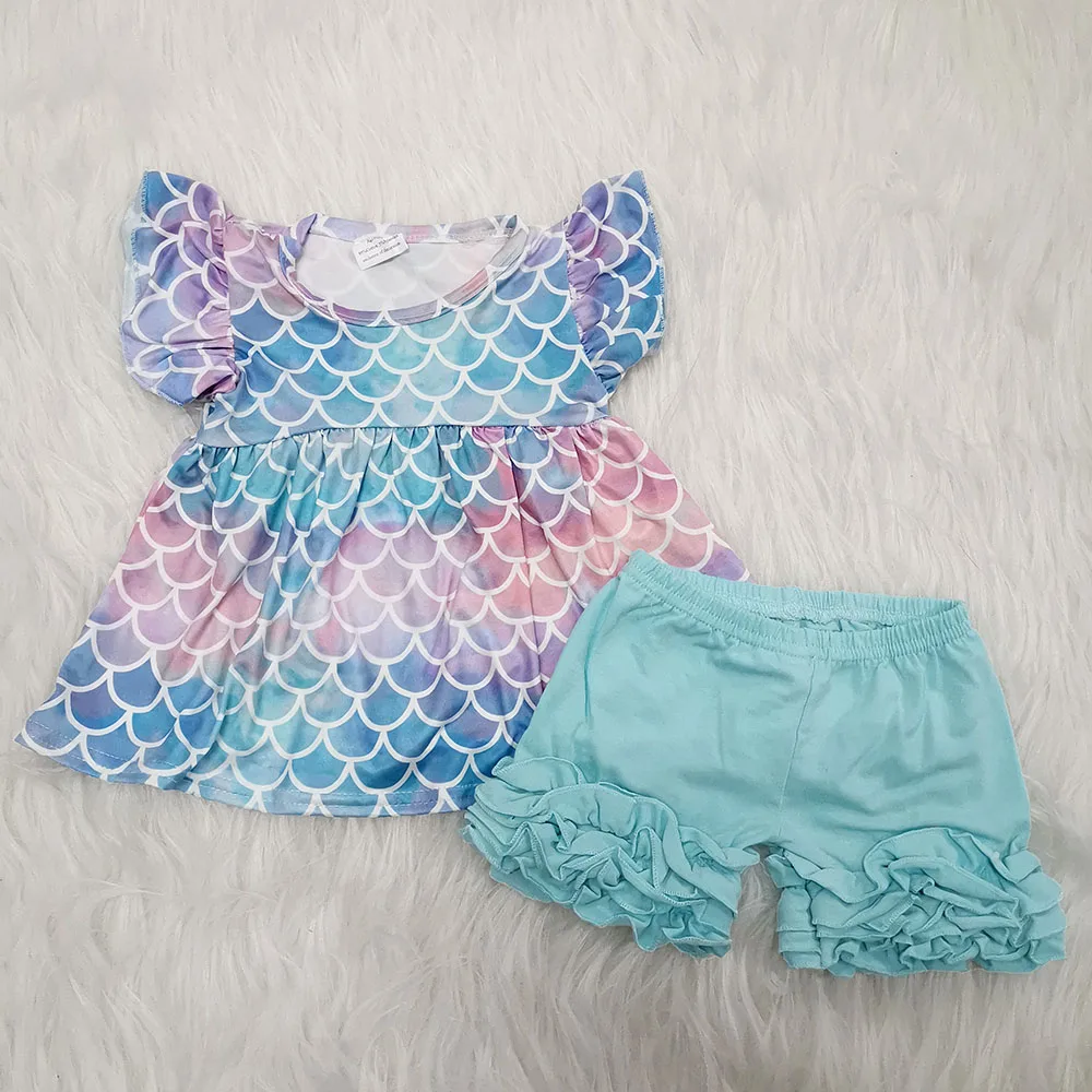 Детский бутик; Летняя модная одежда с рыбками; Топ с оборками и круглым вырезом для девочек и шорты; Комплект одежды