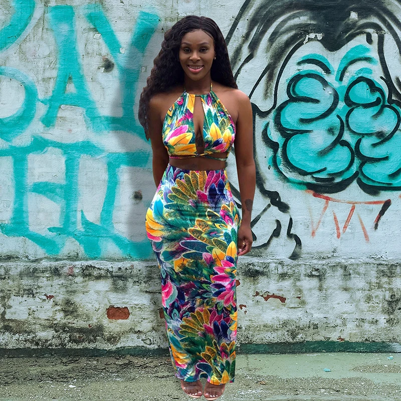 Сексуальный спортивный костюм с цветочным принтом, женский короткий топ на бретелях без рукавов, облегающая юбка средней длины, костюм из 2 предметов, комплект с платьем, комплект из двух предметов