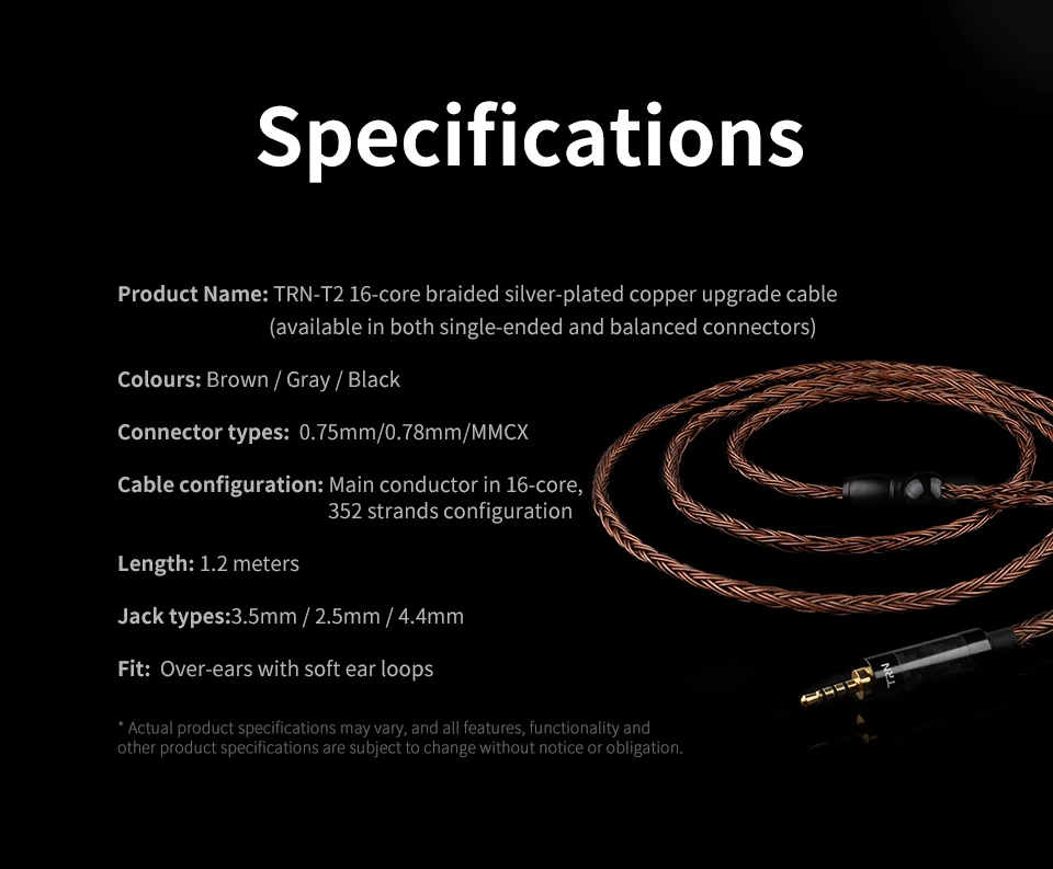 1. Название продукта: TRN T2 16 CORE 2. Бренд: TRN T2 3. Цвет: черный/коричневый/серебристый 4. Материал: посеребренный медный кабель 5. Тип штекера: 2,5 мм/3,5 мм/4,4 мм 6. Количество ядер: 16 ядер 7. Кабель Длина: 1,2 CM ± 0,2 8. Интерфейс: MMCX/2Pin разъем 9. Использование для: SE535/SE846/UE900/ LZ A6/A5/A4/A3/ CCA C04/C10/C16 KZ BA10/AS10/ZS10/ZSR/ZST/ED12/ES3/ES4 KZ ED16/ZS6/ZS5/ZS3/ZS4/ZSA/ZS3E/ZS7 TRN V10/V20/V30/IM2/V80/IM1/X6 Yinyoo BK2/V2/D2B4/Топаз/зола TFZ/ AUGLAMOUR/ BQEYZ/REVONEXT наушники и так далее.