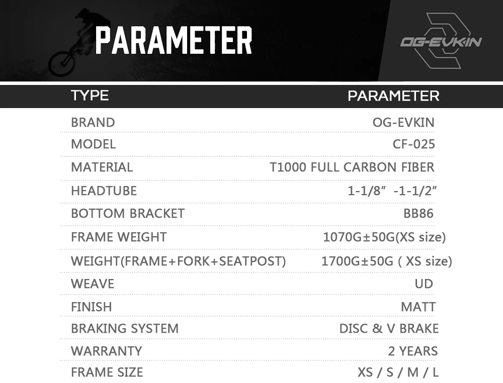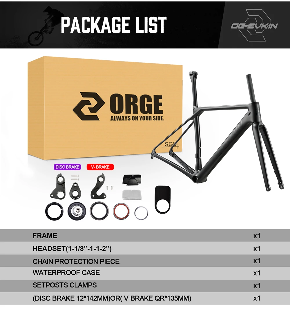 OG-EVKIN 2019 карбоновый дисковый тормоз для дорожной рамы UD BB86, велосипедная дисковая рама, комплект Di2, вилочный зажим XS S M L 1-1/8 дюйма-1-1/2 дюйма и V-тормоз Модель: CF025 Материал: T1000 полностью углеродное волокно Насадка: 1-1/8 дюйма-1-1/2 дюйма Нижний Кронштейн: BB86 Вес оправы: 1070 г +/-50 г (XS) Вес (рама + вилка + подседельный штырь):1700 г +/-50 г (XS) Переплетение: UD Отделка: матовая Тормозная система: дисковый тормоз/V-тормоз Размер оправы: XS/S/M/L Максимальная шина дискового тормоза: 28C Максимальная шина V-Brake: 25C Размер передней части: 12x10 0 мм/QRx100 Размер задней части: 12x14 2 мм/QRx135