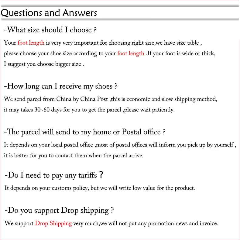 1. Мы не американские размеры. Мы не европейские размеры. В Китае только длина стопы определяет правильные размеры. Не измеряйте длину подошвы. Не измеряйте длину стельки. Пожалуйста, измерьте длину вашей стопы, а затем выберите размер в соответствии с нашей таблицей размеров. 2. Если вы чувствуете неприятный запах, это нормально, потому что новая обувь может иметь запах клея. 3. Фотография может отличаться от реальной обуви, фотография может быть яркой, настоящая обувь может быть темной. 4. Мы упаковываем обувь в пенопластовую сумку, а не коробку, поэтому обувь может немного помяться после получения.