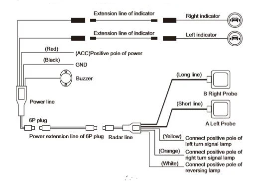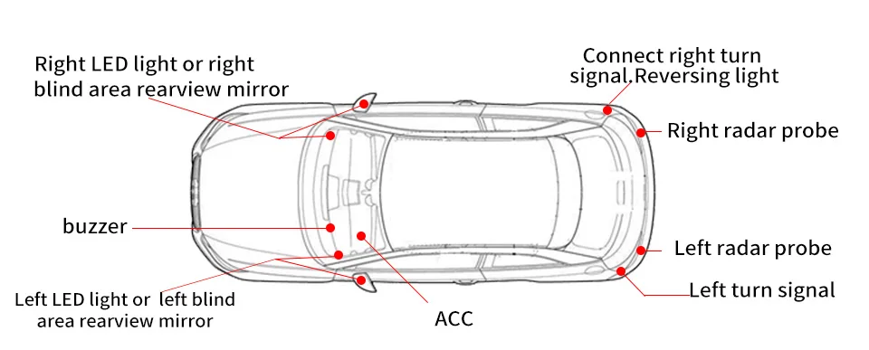 * Установите датчик радара на заднюю часть автомобиля после снятия заднего бампера. * Чем выше высота установки радара, тем дальше расстояние обнаружения. * Замените Оригинальное автомобильное боковое зеркало, Подключите светодиодный провод к радарной системе. * Подключите провод рядом со стеклом к индикаторному светильник с положительным электродом для управления зуммером. * Подключите провод питания к автомобильному ACC положительному электроду. И Подключите отрицательный электрод к отрицательному электроду батареи.