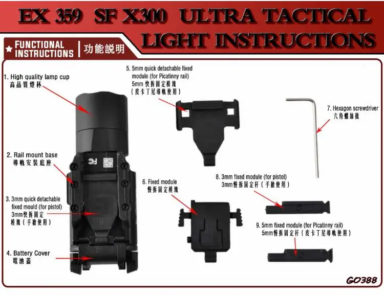 Описание Цвет: черный/коричневый Подходит: пистолет-фонарик и Крепление Пикатинни Часть №: X300U-A Модель: пистолет X300 Тип: сигнальные огни Модель светодиода: CREE-XPE-R5 Типы легких чашек: микро-Апельсиновая кожура Функциональный режим: один файл часто яркий Материал: алюминий Световой поток: 510лм Максимальный диапазон: 160 м Продолжительность Выносливости: 1,5 ч Напряжение: 6 В Ток: 1.0A Длина: 98 мм Диаметр ободка: 1,13 Вес с батареями: 75 г Батареи: 2X CR123A (не входят в комплект)