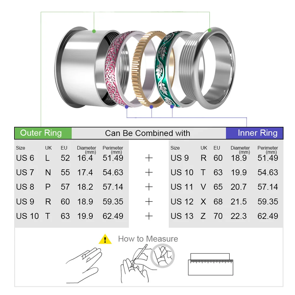 Обручальные кольца Cremo BOHO Femme Bijoux, медная комбинация из нержавеющей стали, сменная медитация, тревога, рельефная лента, бесплатная коробка Для комбинированного кольца в качестве основы должен быть выбран вариант внешнего кольца. Просто Открутите внешнее кольцо и соедините с широким разнообразием внутреннего кольца. Сделайте заявление с нашими привлекательными новыми заполненными кольцами и специальными узорами заполняющих колец. Добавьте цвет в любую комбинацию! Просто скручивайте декоративные элементы друг в друга, и ювелирные изделия сдельно, чтобы создать совершенно новый вид! Расширьте комплект ваших топовых частей с новыми топовыми частями, новое базовое кольцо верхней части и соответствующие серьги-кольца. Выберите дизайн и измените внешний вид ваших ювелирных изделий на один шаг. Обратите внимание на следующую особенную особенность при заказе комбинации наружных и внутренних колец: для внутреннего кольца, чтобы соответствовать внешнему кольцу, внутреннее кольцо должно быть выбрано соответственно больше. Чтобы узнать правильный размер кольца, вам нужно только нить или кусок бумаги. Оберните нить или бумагу вокруг части пальца, где вы хотели бы носить кольцо, а затем Измерьте его длину. Длина, измеренная в миллиметрах, будет внутренней окружностью кольца. Ваш вкус, ваше сочетание, Создайте свое кольцо!