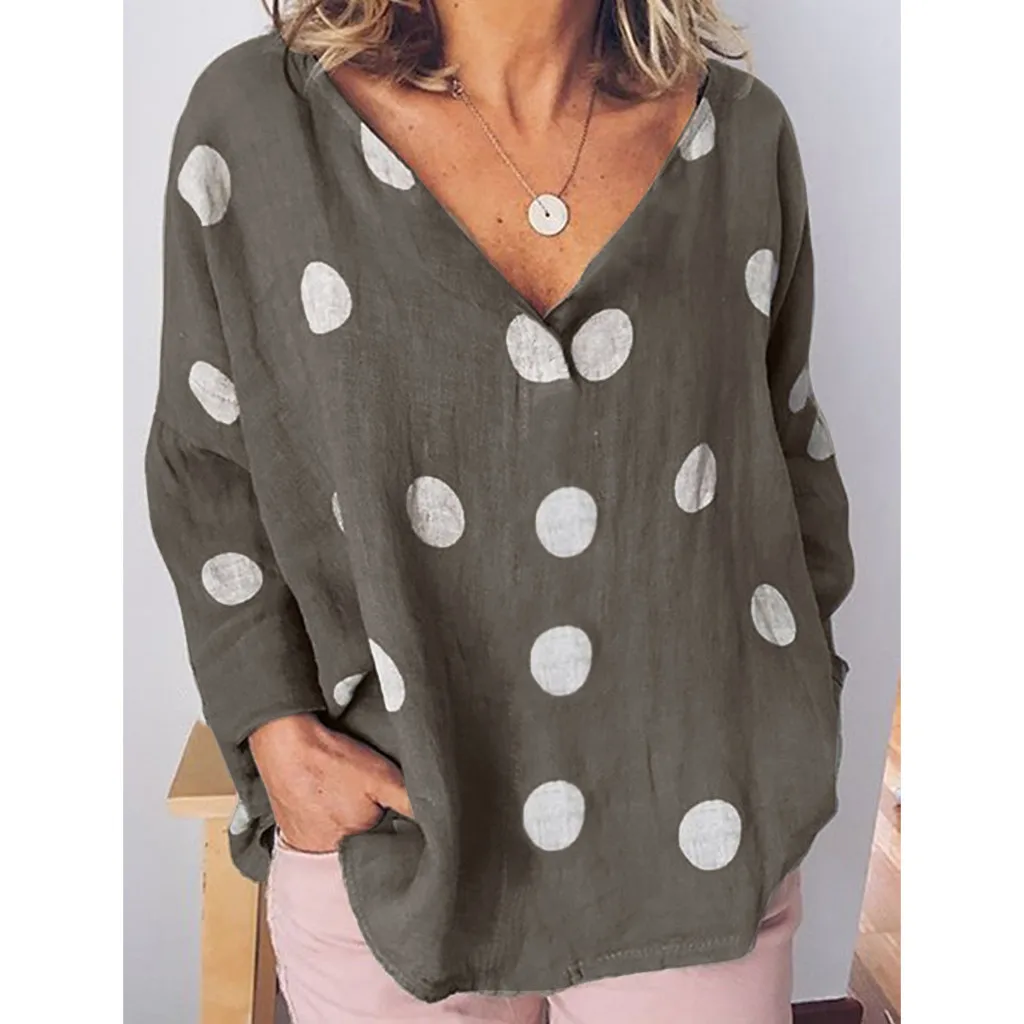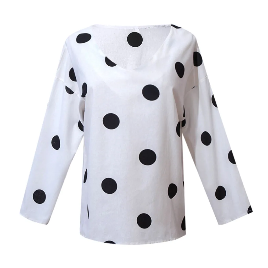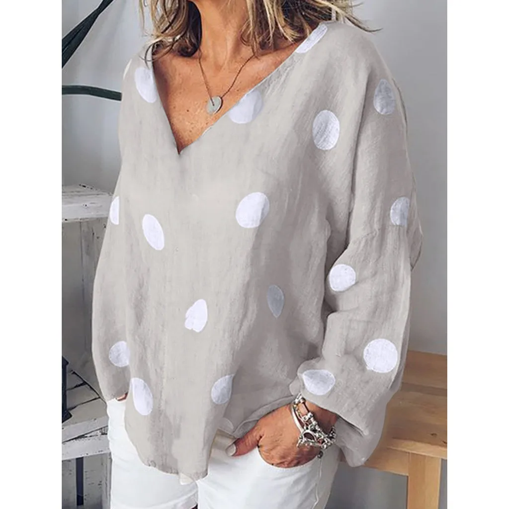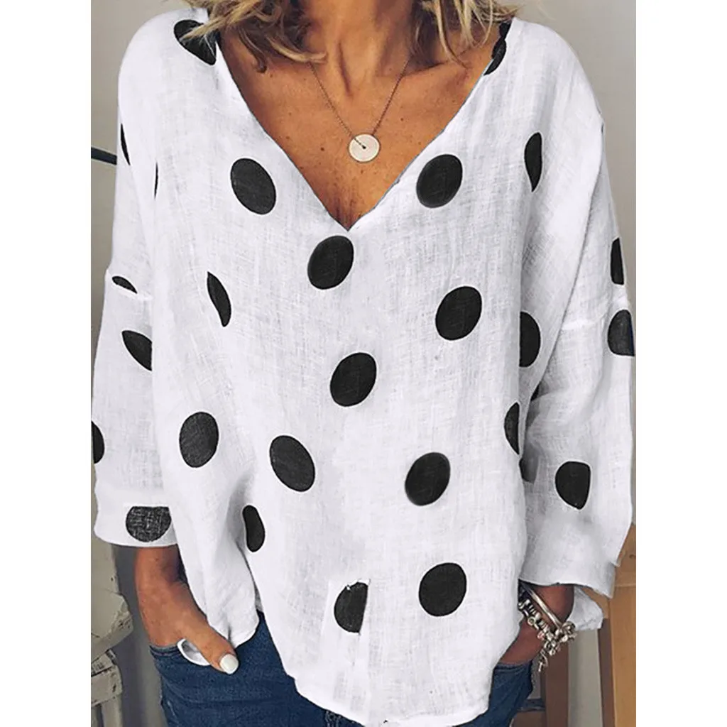 Женская Повседневная Блузка в горошек, свободная рубашка с v-образным вырезом и длинным рукавом