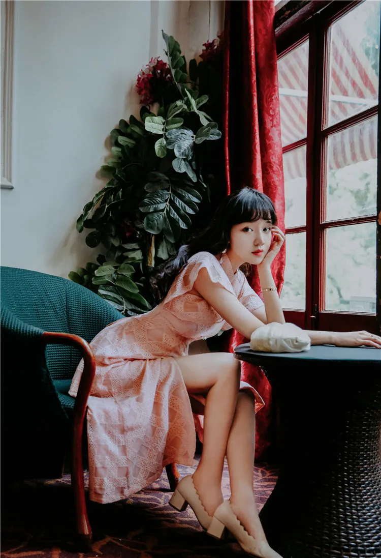 Французский Романтический Китайский Cheongsam розовое платье с разрезом элегантное кружевное платье с воротником-стойкой и жемчужными пуговицами однобортное летнее платье женское платье