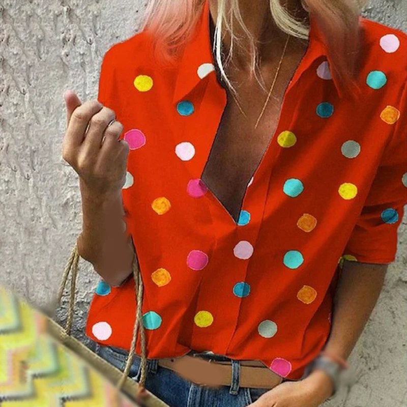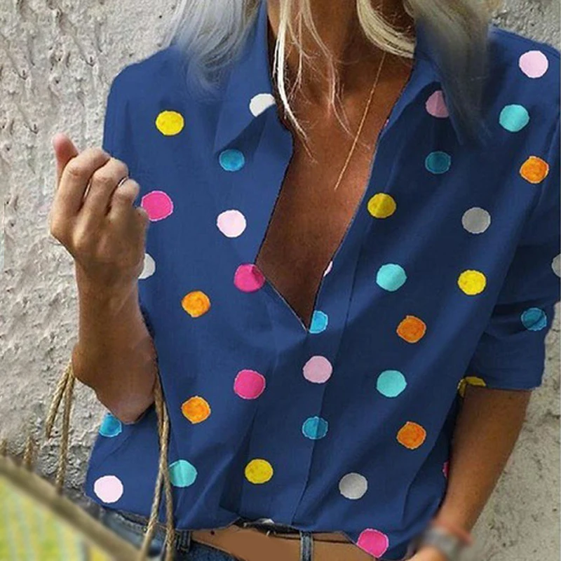 * Описание товара:Женская одежда, летние топы, рубашка, свободный принт с длинным рукавом, отложной воротник