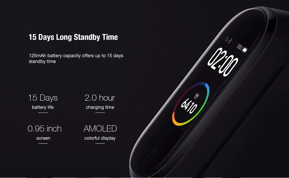 125МAЕмкость батареи h обеспечивает до 15 дней в режиме ожидания.2,0 часовое время зарядки 0,95 дюймовый AMOLED цветной экран.