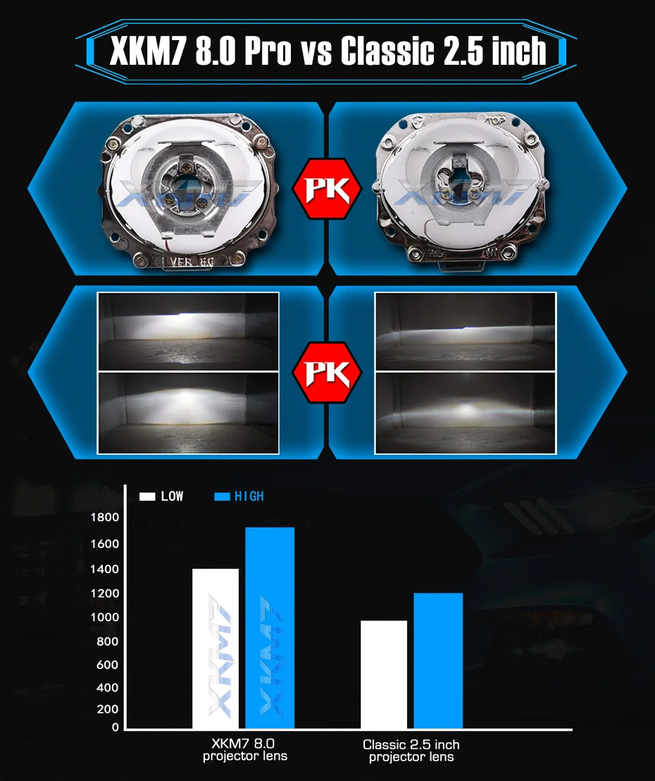 Это версия XKM7 8,0 pro, которая применяет новый дизайн «двойной слой» в отражателе, выход светильник стал намного лучше, чем предыдущие поколения.
