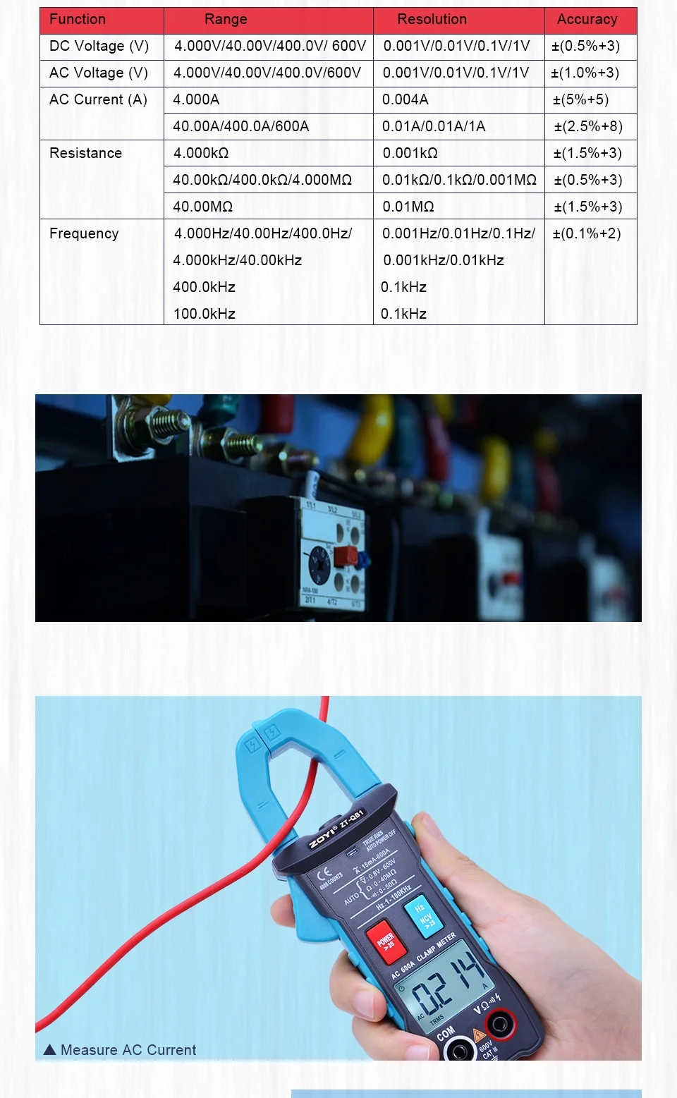 40.00A/400.0A/600A | 0.01A/0.01A/1A | ±(2.5% + 8) | ||