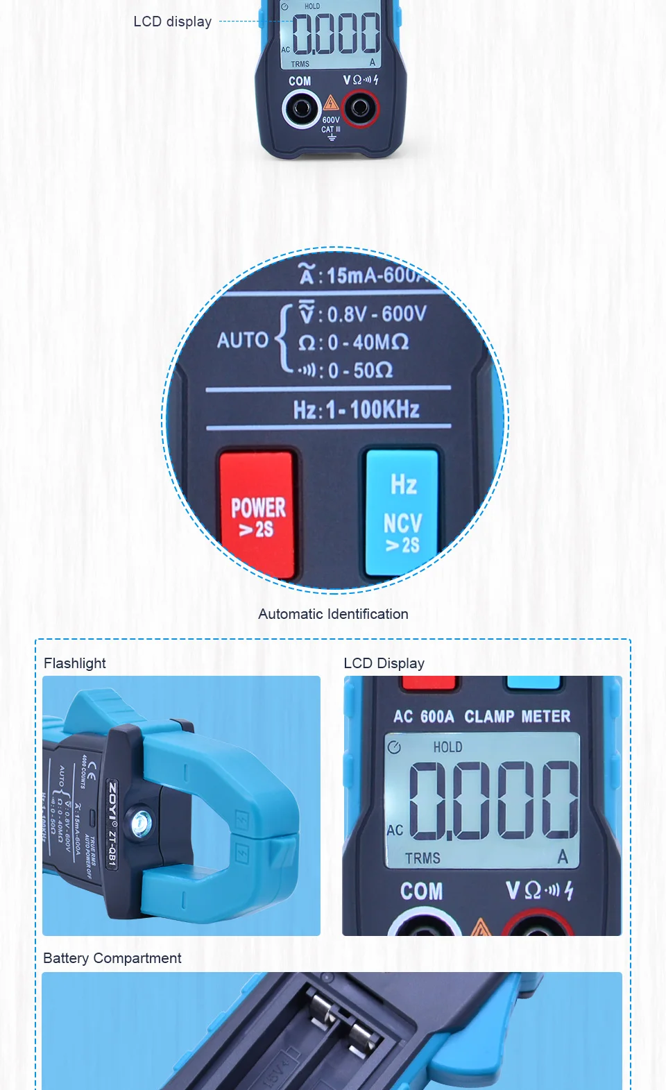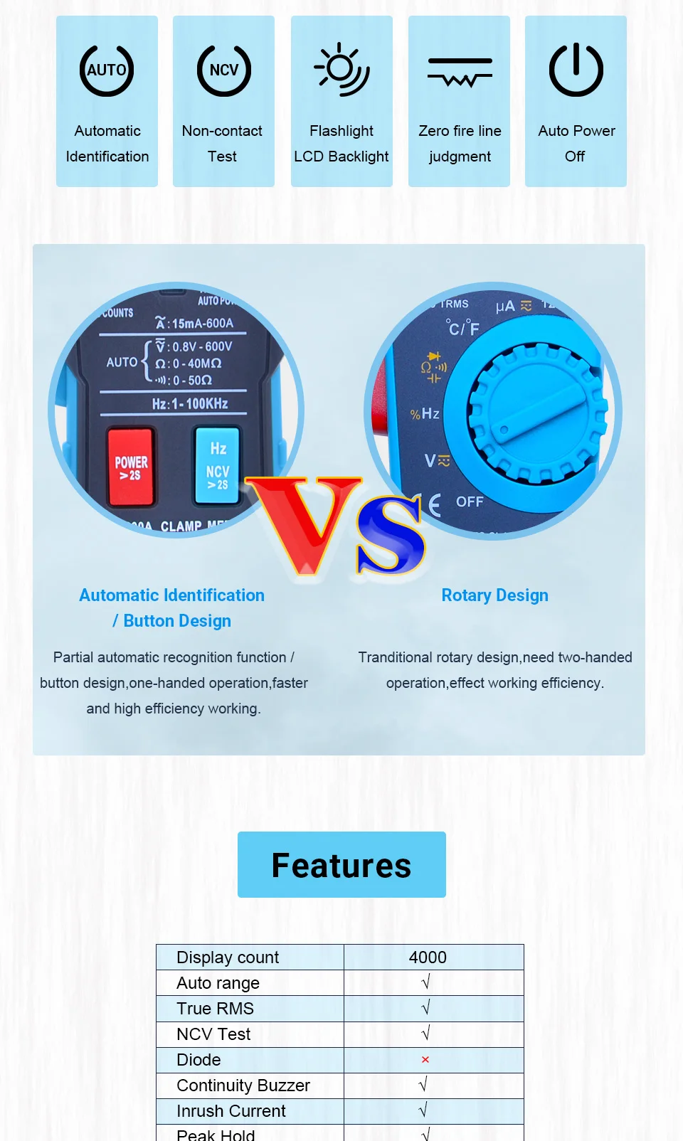 Этот продукт работает от аккумулятора, true-rms, автоматический цифровой зажим