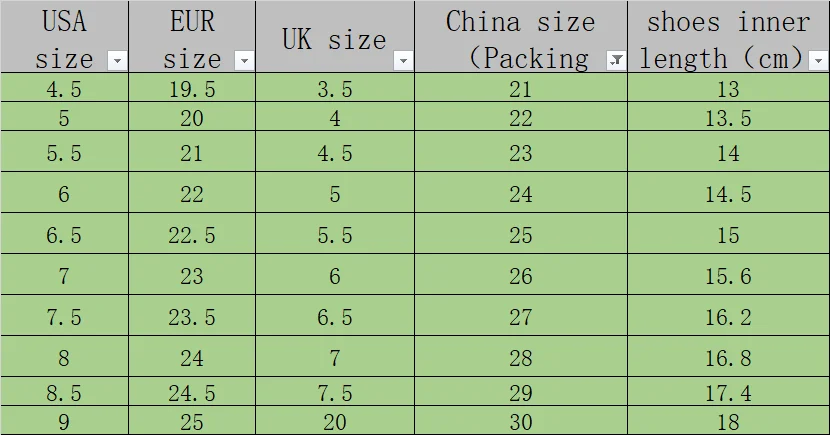 Уважаемый клиент: поскольку в каждой стране есть разные этикетки размеров, поэтому выберите правильный размер, необходимо измерить длину стопы ребенка, проверьте информацию о размере.