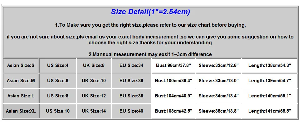 | Азиатский Размер: XL | Размер США: 10 | Размер Великобритании: 14 | Европейский размер: 40 | Обхват груди: 108См/42,5" | Рукав: 35См/13,8" | Длина: 141См/55,5" |
