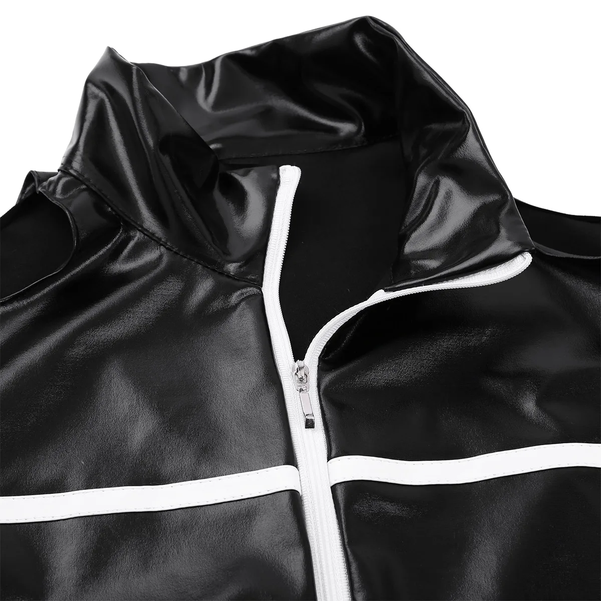 Воротник-стойка, длинное пальто без рукавов и с открытой спиной, дизайн с вырезами на плечах, с белой полосой на груди и манжетах, застежка-молния спереди.