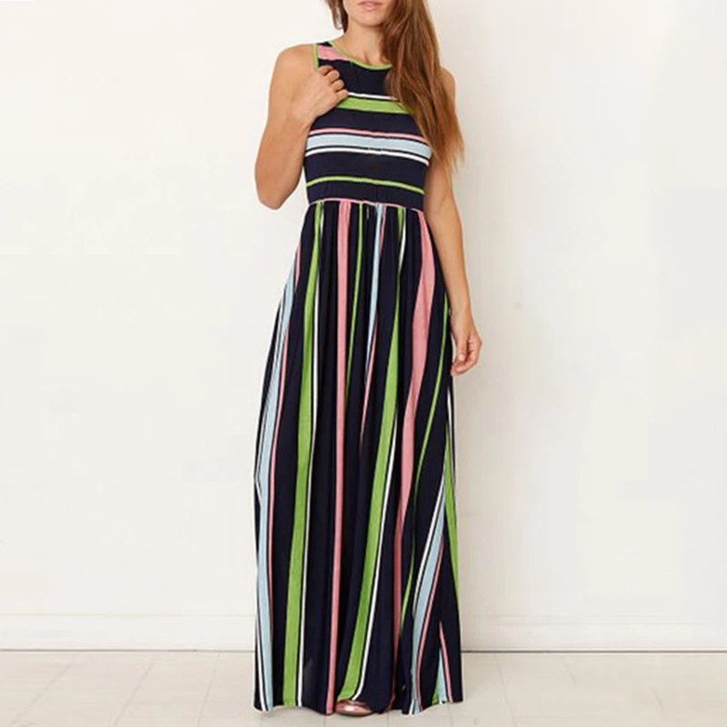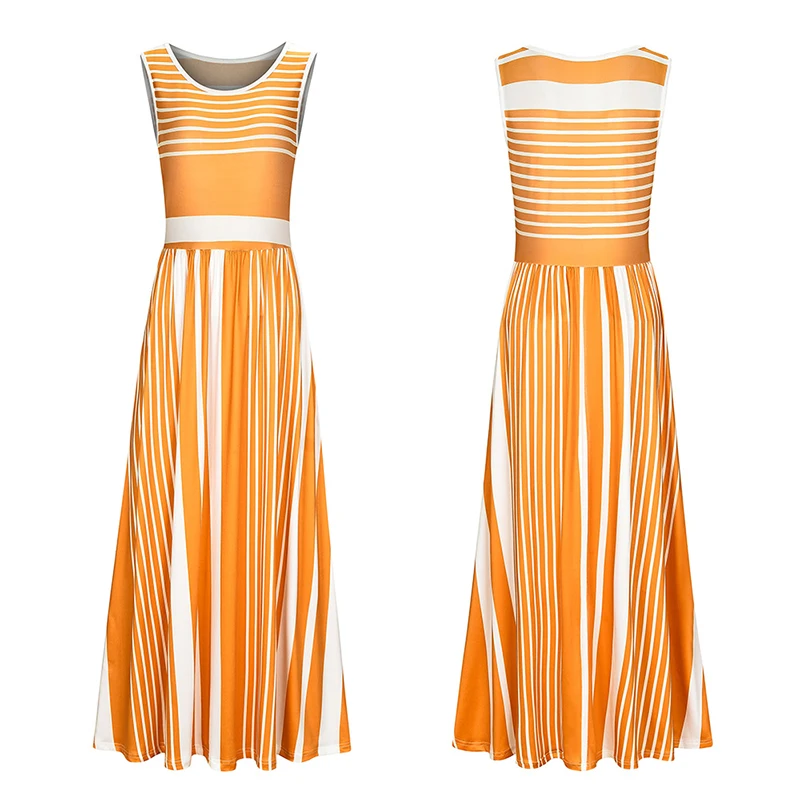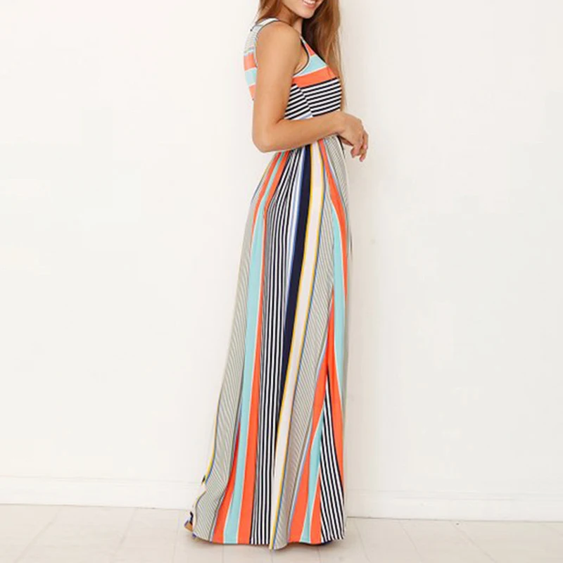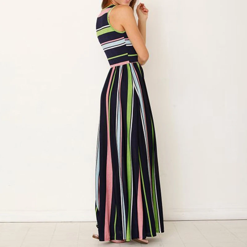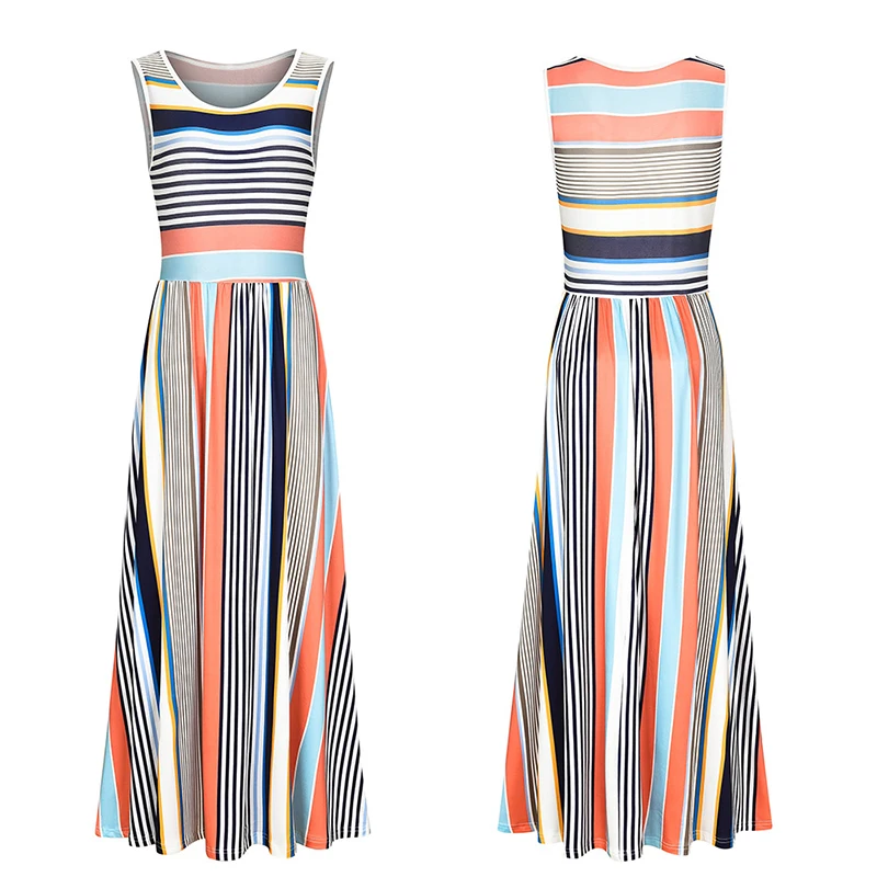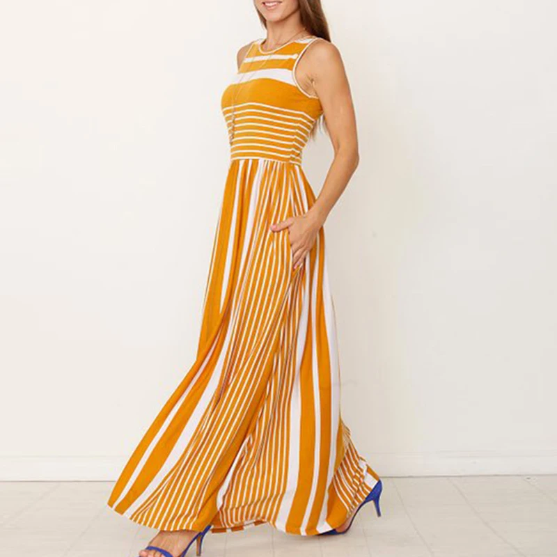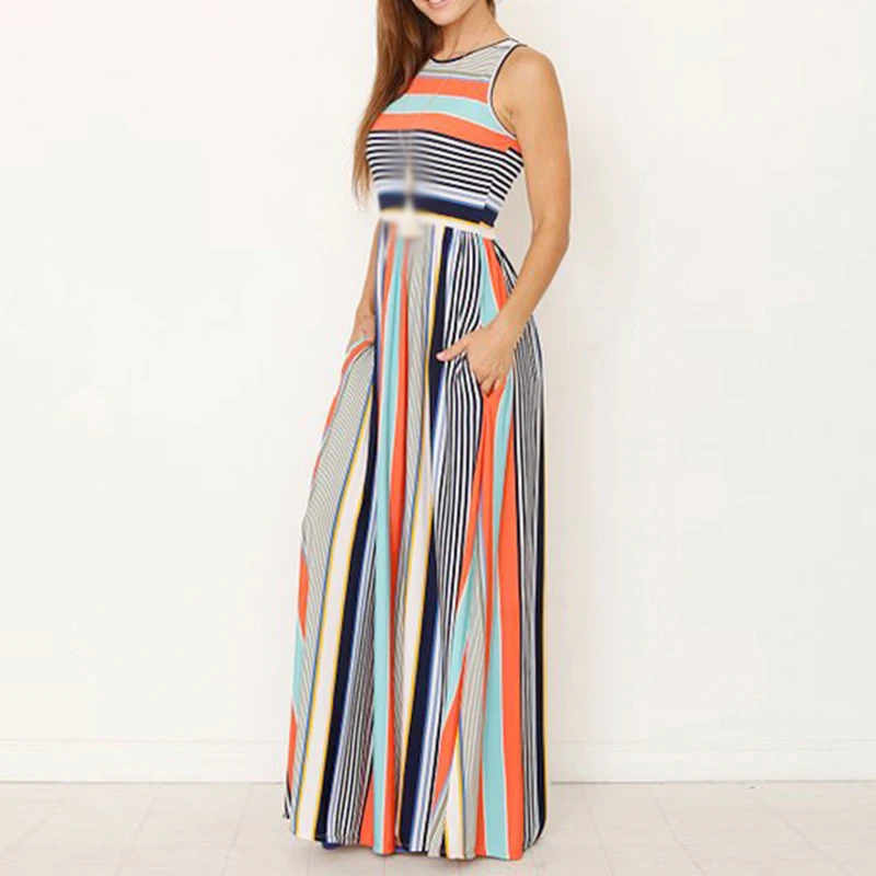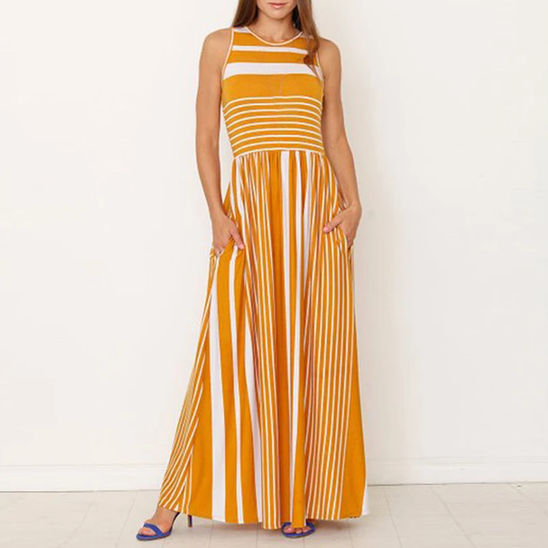 * Описание товара: женское повседневное летнее Полосатое длинное пляжное платье без рукавов с вырезом лодочкой и карманом