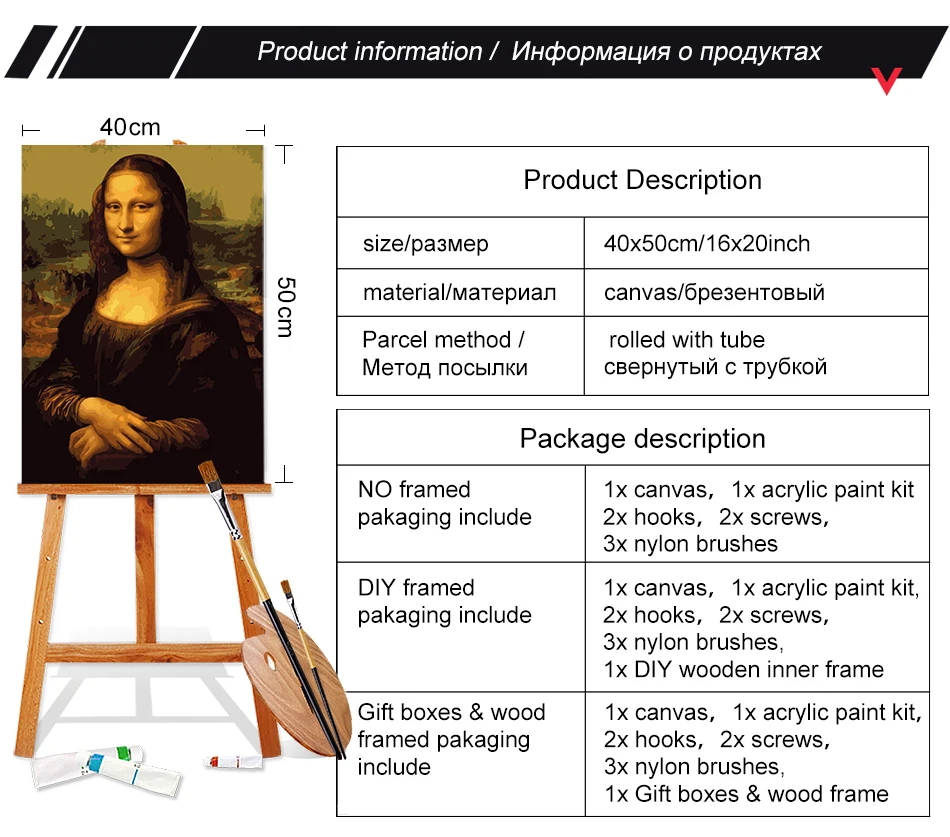 Посылка включает в себя:Без рамки (акриловая краска, холст, нейлоновая кисть x3)
