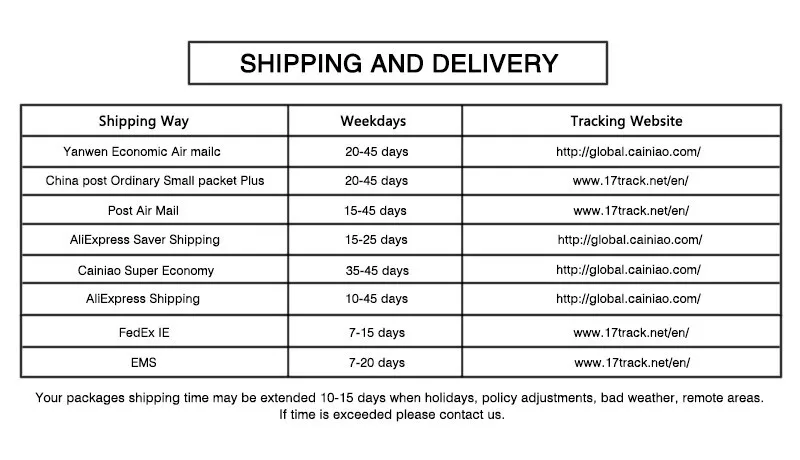 Обратите внимание, что заказ менее 5 долларов США, мы отправим Почта Китая обычными маленькими пакетами Плюс или Cainiao Super Economy. Но скорость такая же, прибудет вовремя. Заказы на сумму более 5 долл. США можно отследить. Если у вас есть какие-либо вопросы, пожалуйста, свяжитесь с нами.