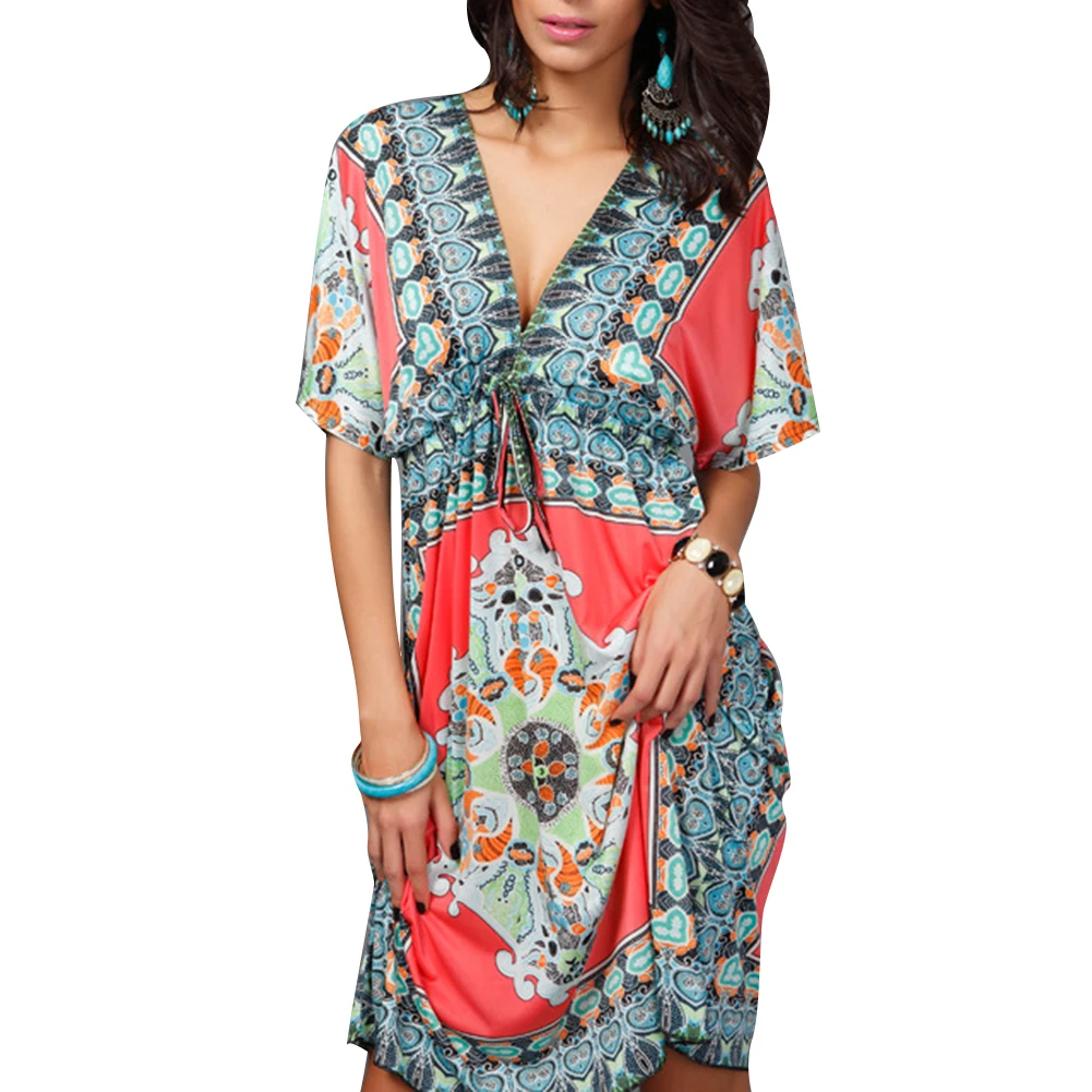 Модные летние выходные пляж женский сарафан этнический цветочный принт глубокий v-образный вырез короткий рукав леди сексуальный купальник мини платье