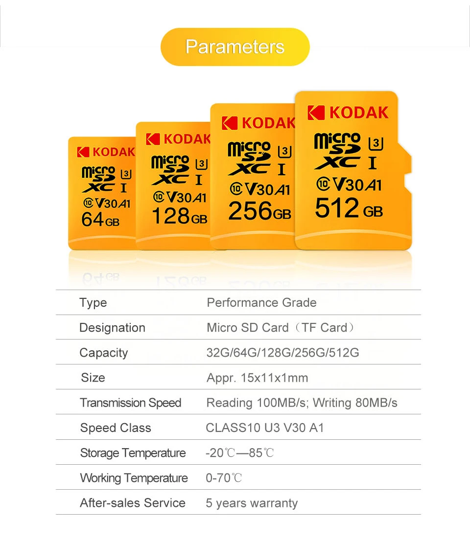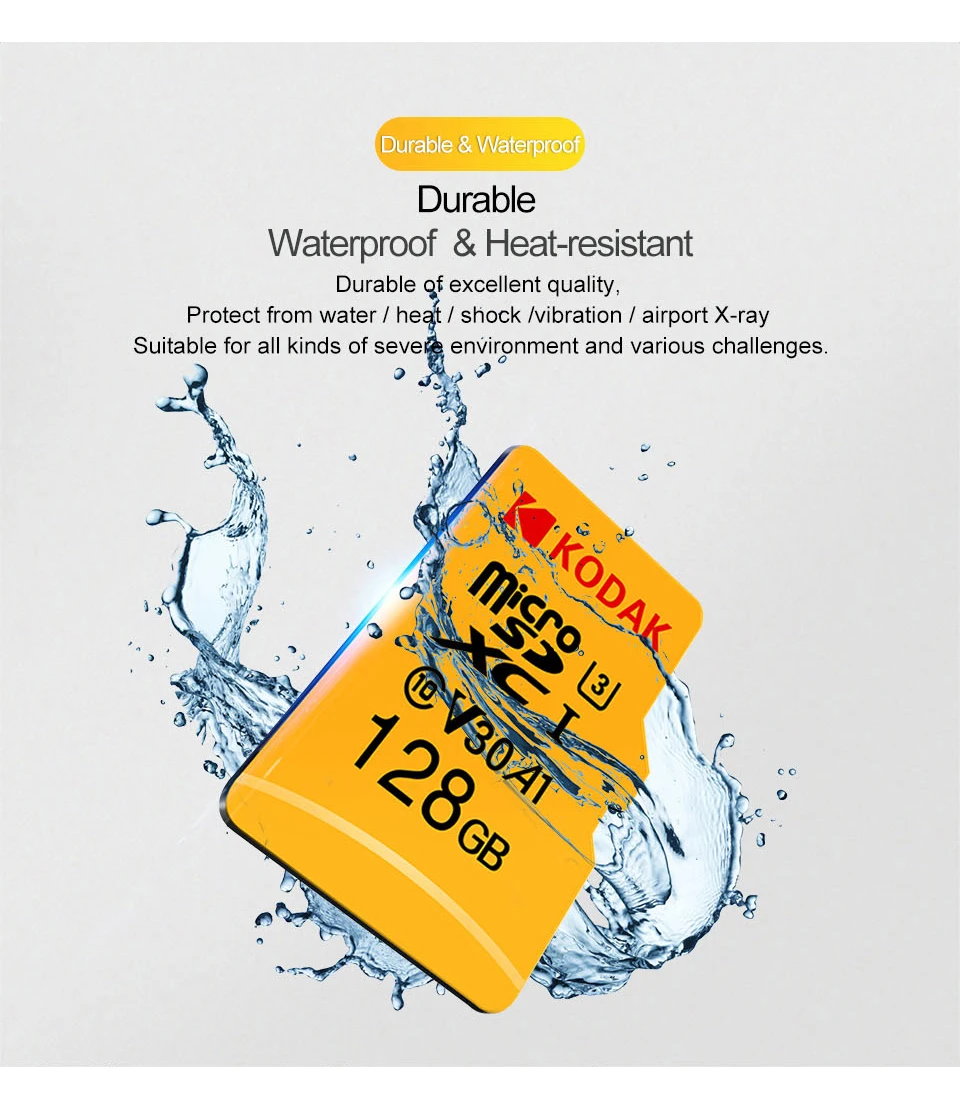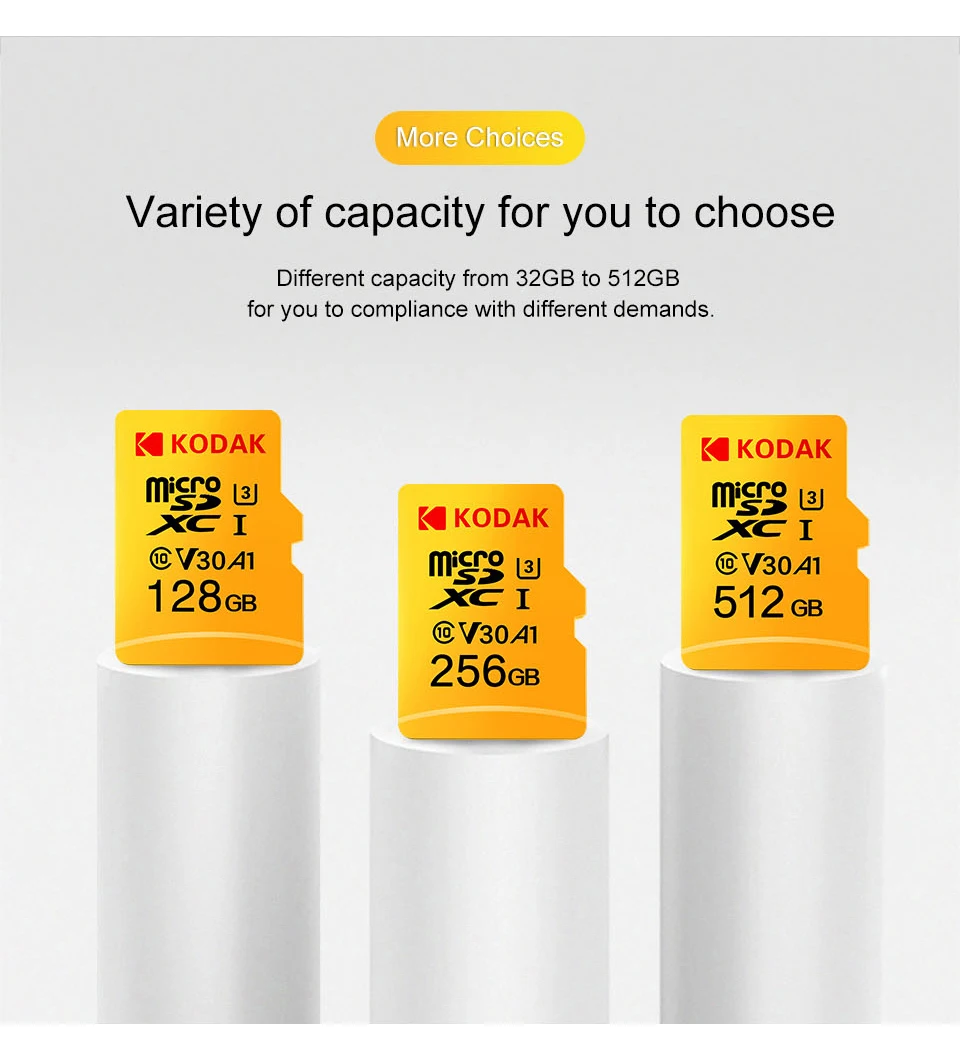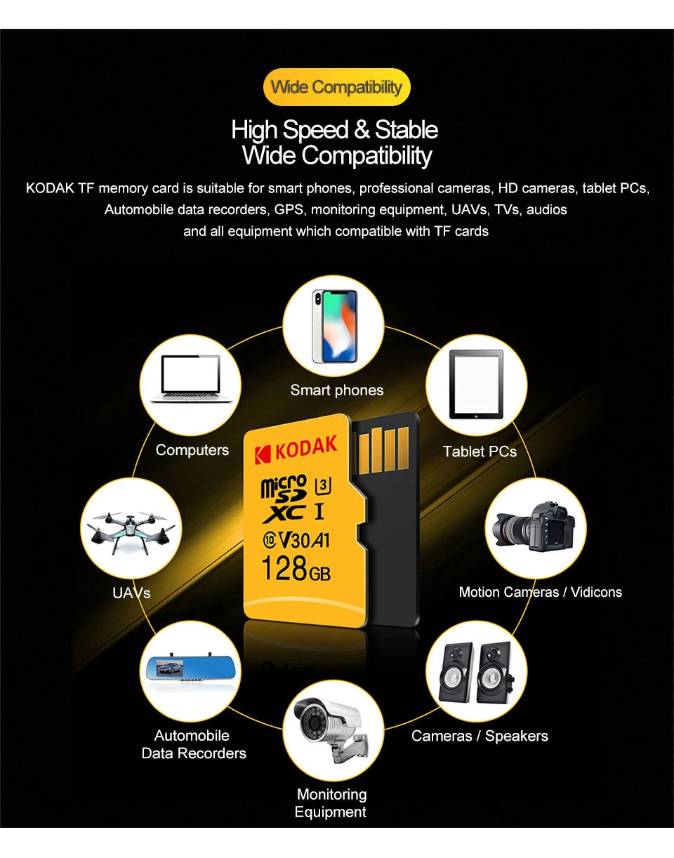 Карта TF KODAK подходит для смартфонов, профессиональных камер, HD камер, планшетных ПК, автомобильных регистраторов данных, GPS, оборудования для мониторинга, UAVs, телевизоров, аудио и все оборудование, совместимые с tf-картой.