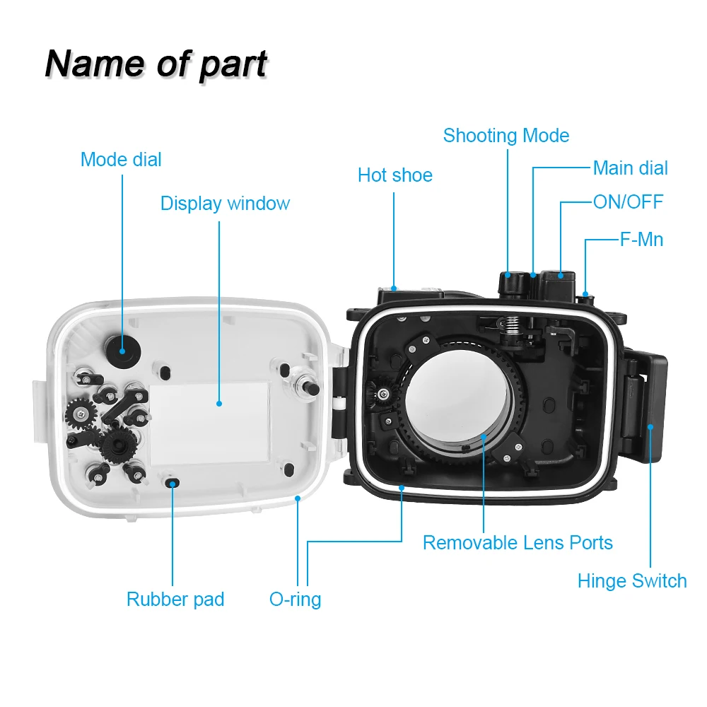 Название продукта: водонепроницаемый чехол для камеры Canon EOS M5 M6 18-55 мм 22 мм Бренд: seafrogs, meikon Материал: алюминиевый сплав, стекло, EPDM щебень, уплотнительное кольцо Уровень IP: IPx 8 Глубина погружения: макс. 40 метров (130 футов) Рабочая температура: 0-40 градусов Защита от обуви: 1 метр Водонепроницаемый элемент: уплотнительное кольцо уплотнительная прокладка