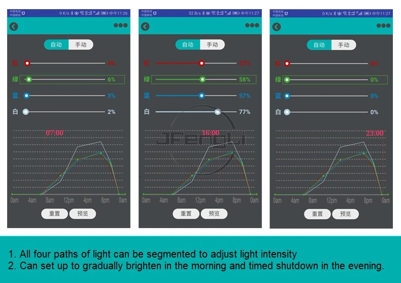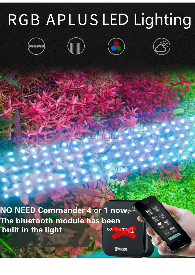 Может включать и выключать светильник на регулярной основе, набор восходом и закатом солнца светильник изменение интенсивности, выбрать различные светильник ing режимов (красный, трава, зеленая трава, перца, фикус, декоративные рыбы, с украшением в виде кристаллов для ловли креветок светильник полностью включен, можно настроить три режима для экономии), также можно настроить красный, Зеленый и синий светильник, чтобы добиться изменения цвета и нежного ландшафтного эффекта