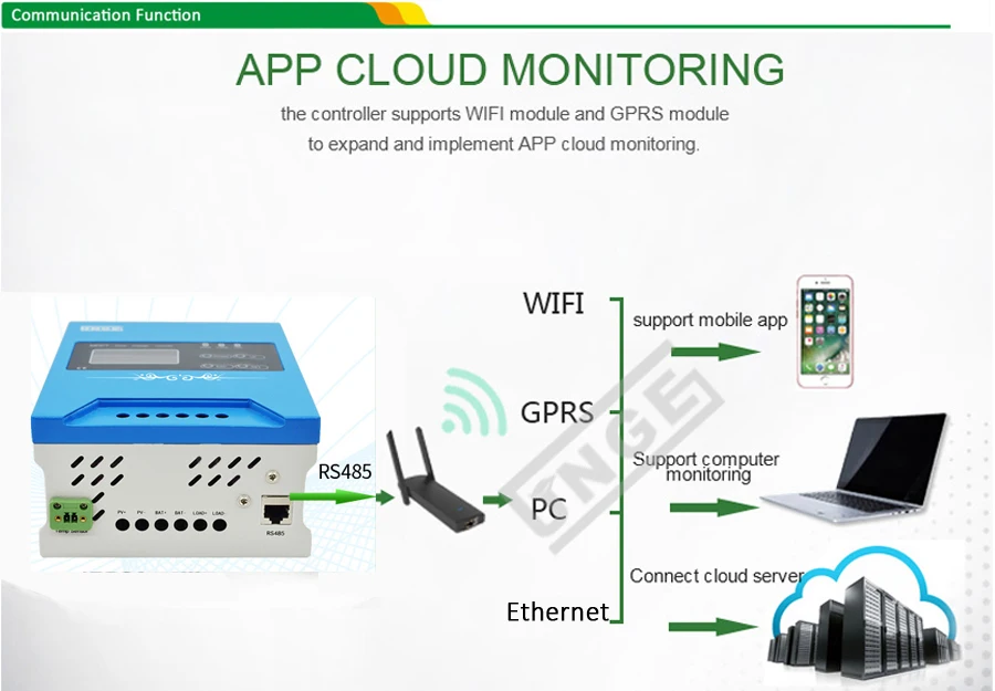 1-Удаленный мониторинг по WIFI, GPRS, Ethernet через порт RS485(Это просто дополнительная часть, контроллер все еще может работать хорошо без него)