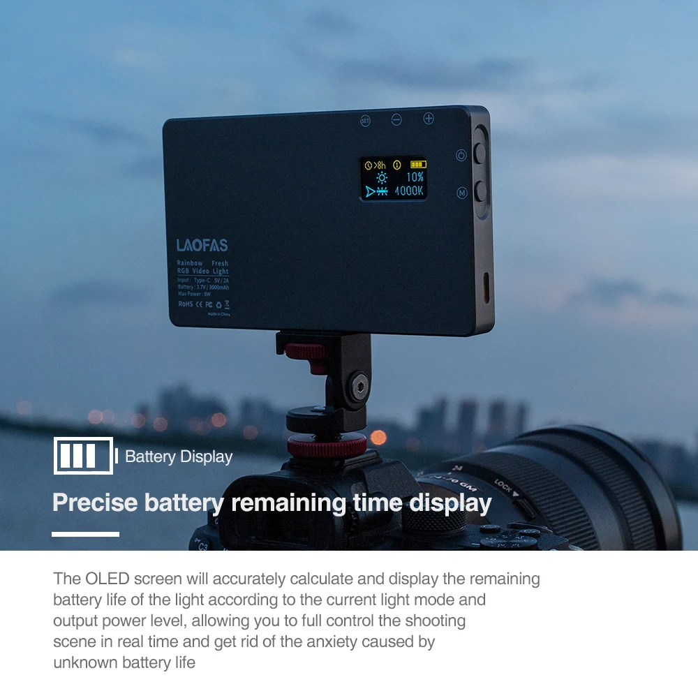 4. 【Precise батареи оставшееся время display】The OLED экран будет точно рассчитать и отображать оставшееся время автономной работы в светильник в соответствии с текущим светильник режим и уровня выходной мощности, позволяет полностью контролировать сцену съемки в режиме реального времени и избавиться от беспокойства, вызванного неизвестным сроком службы батареи