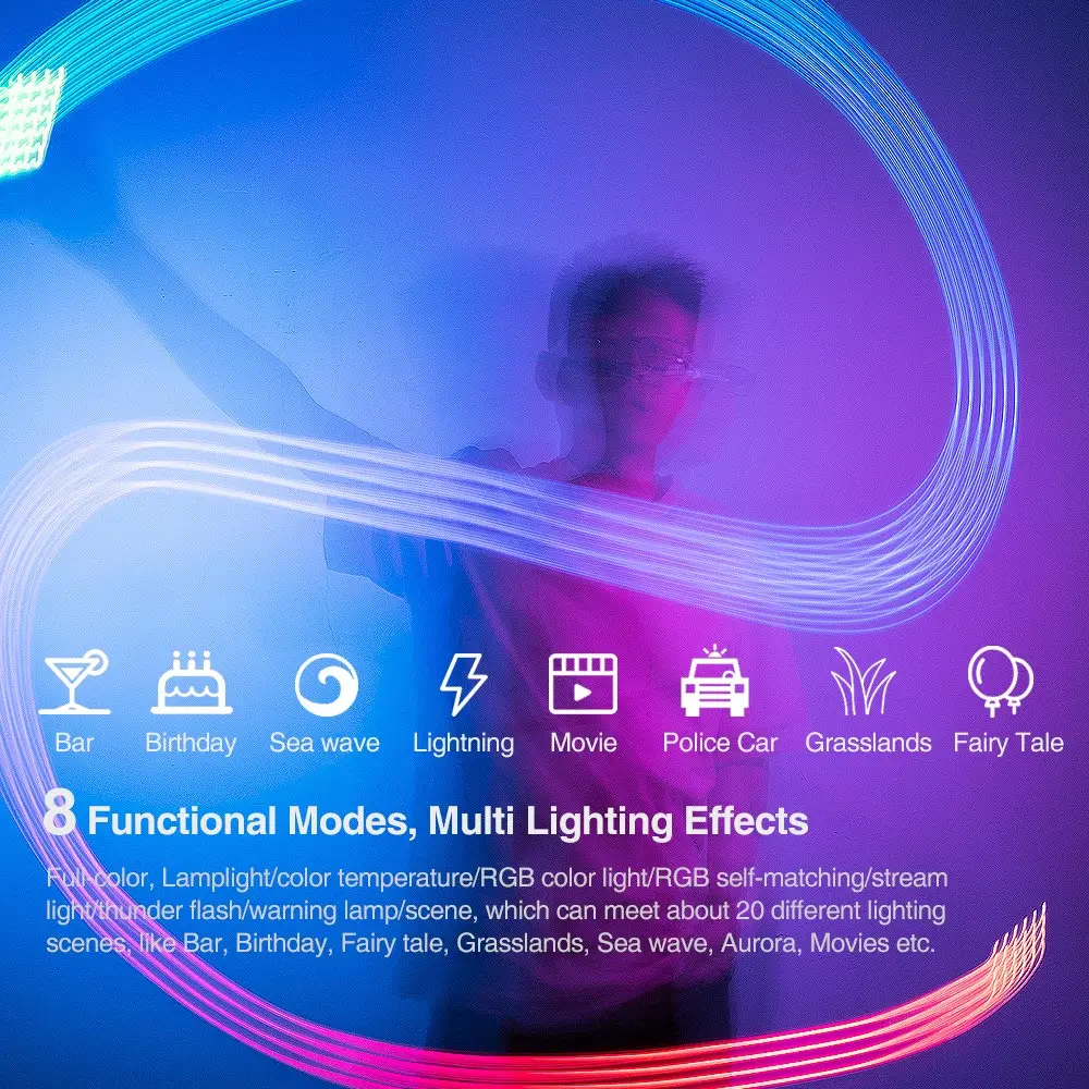 2. 【 8 функциональных режимов, многофункциональный светильник, эффект 0-360 °, полный цвет, светильник/цветовая температура/RGB цветной светильник/RGB само-соответствие/поток светильник/thunder flash/сигнальная лампа/сцена, которая может встретить около 20 различных светильник ing сцен, как бар, день рождения, сказка, луга, морская волна, Аврора, фильмы и т. Д.