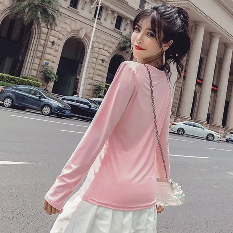 Повседневная Женская футболка с длинными рукавами, женские топы, весна-осень, Футболка женская в Корейском стиле, футболка из хлопка, новая футболка для полных