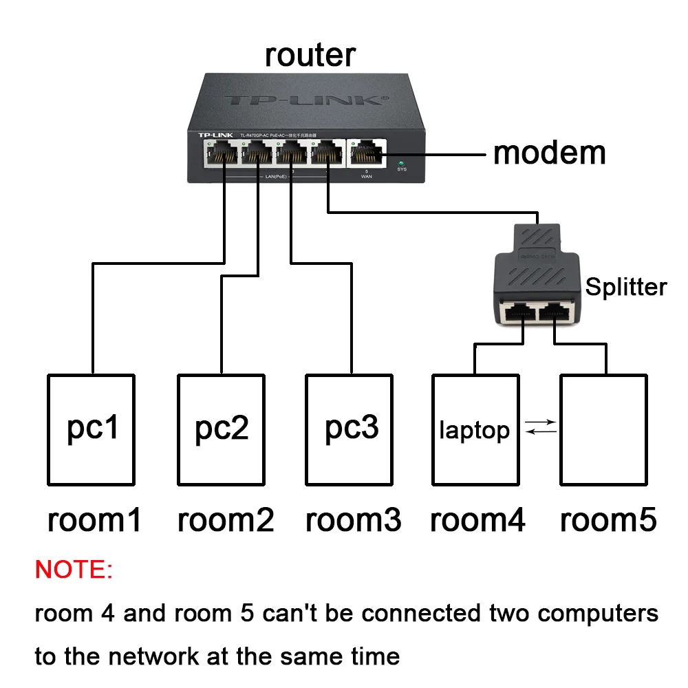 У вас пять комнат, но ваш маршрутизатор имеет только четыре порта lan. Не хватает порта. Этот сплиттер можно использовать для расширения сетевого кабеля для подключения к пятой комнате. При перемещении ноутбука из четвертой комнаты в Пятую комнату, подключите в интернет-кабель, также можно подключиться к сети. Но вы не можете подключиться к сети в четвёртом и пятом помещениях одновременно.