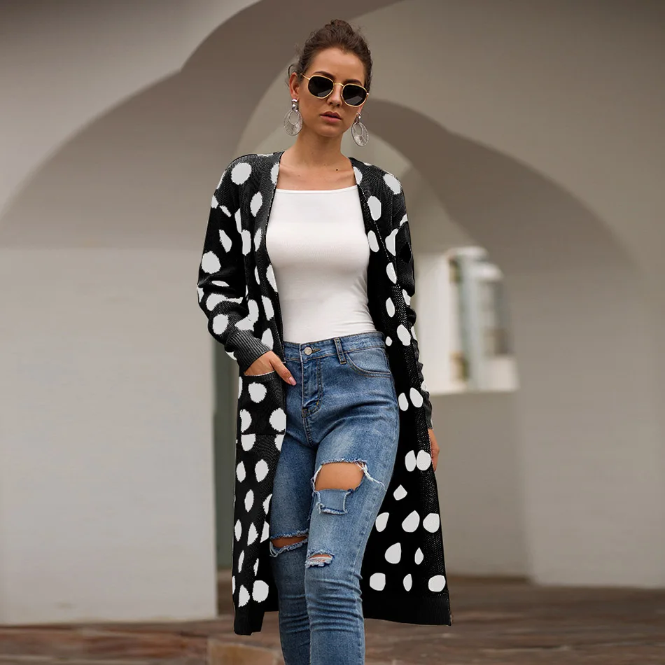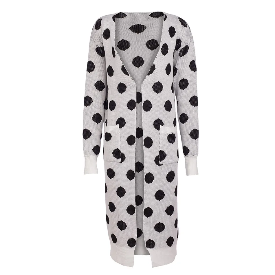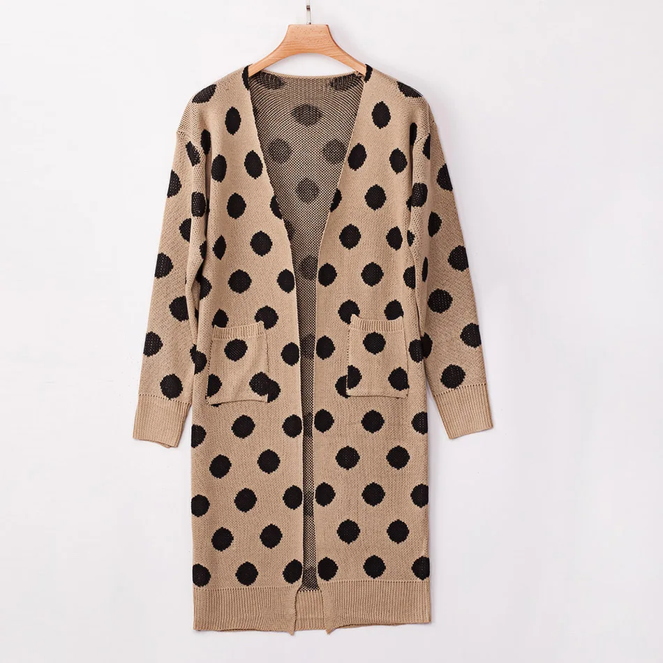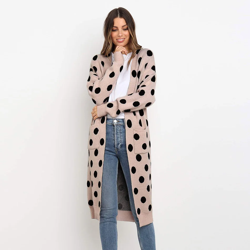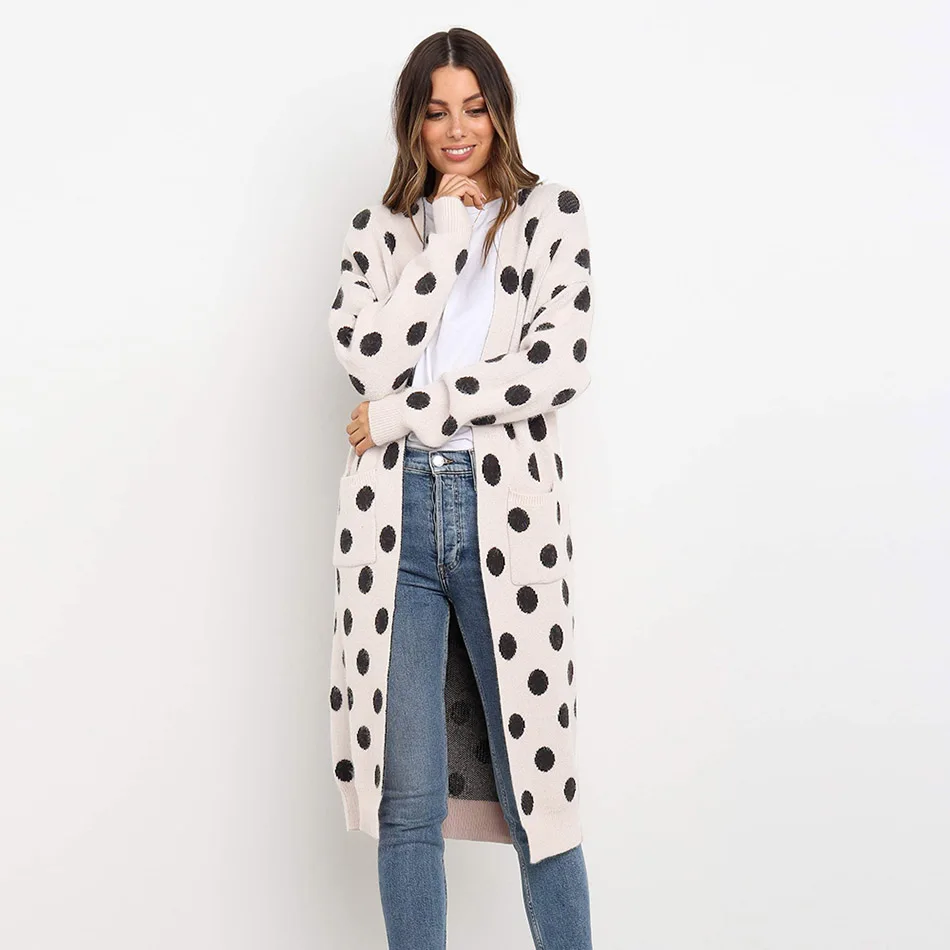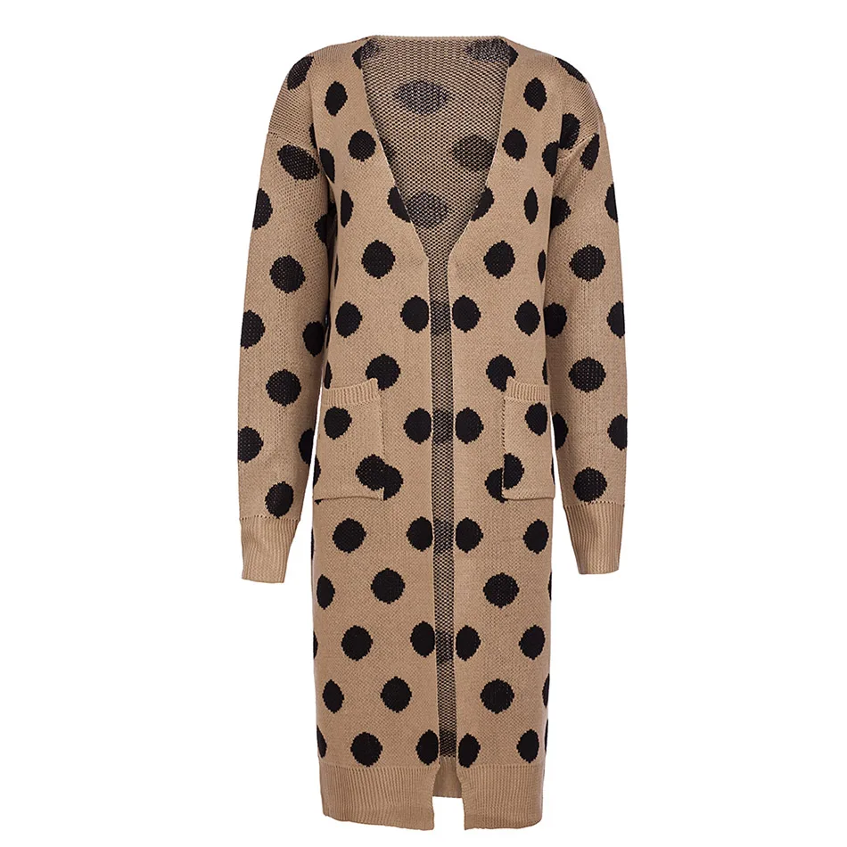 Fashion Knitted Dot Long Cardigan Women Pocket Plus Size Cardigan Mujer Overcoat Streetwear Autumn Blusas De Inverno Feminina