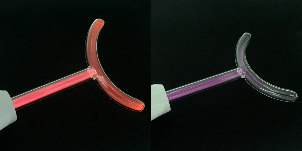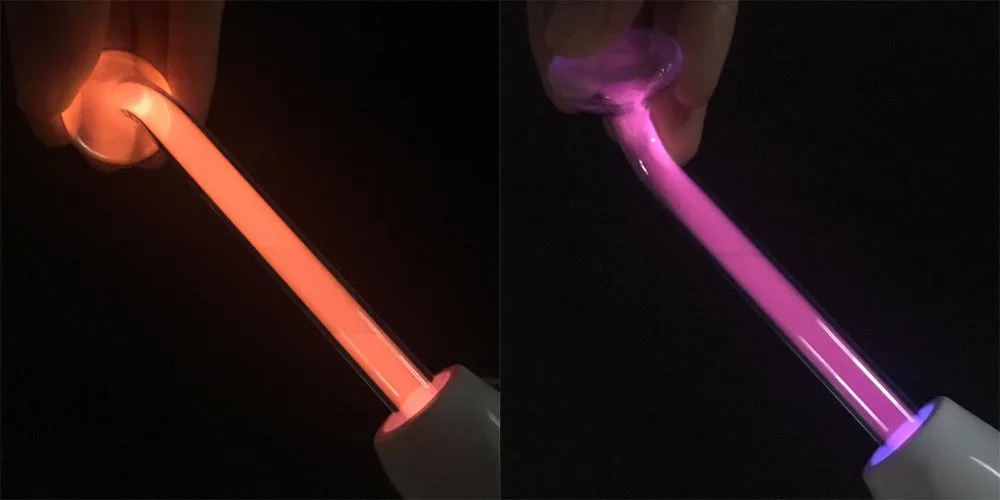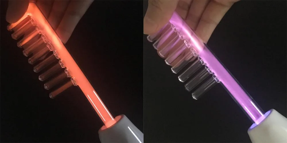2) неоновый газ, который производит оранжевое свечение. Высокочастотный электрод действует как безопасный