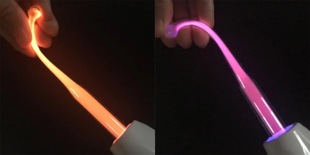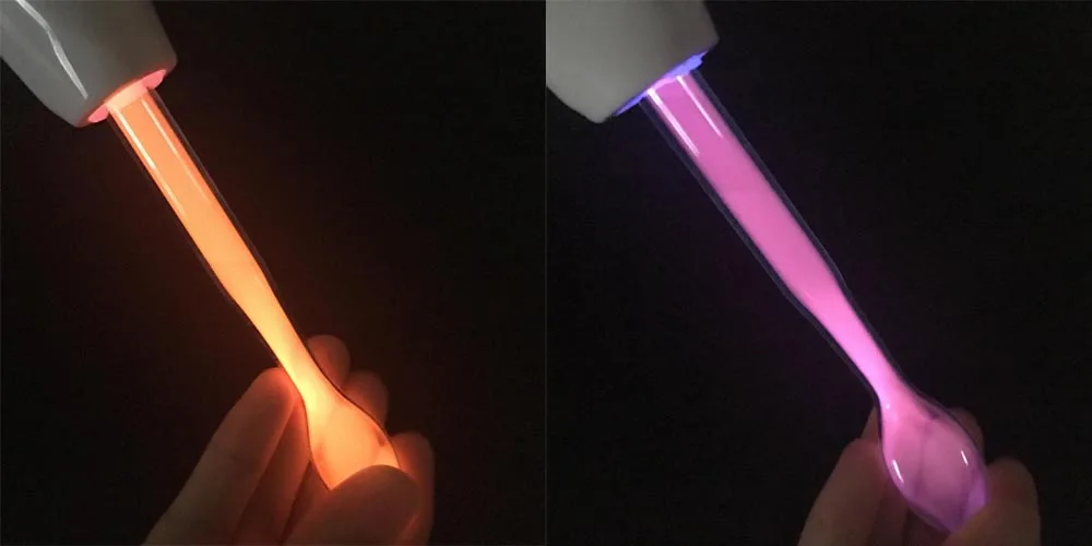 Небольшое количество ультрафиолетовый светильник излучается, когда фиолетовый электрод контактирует с кожей.