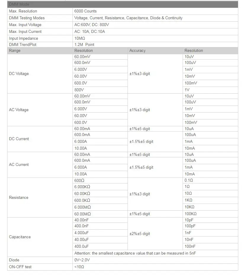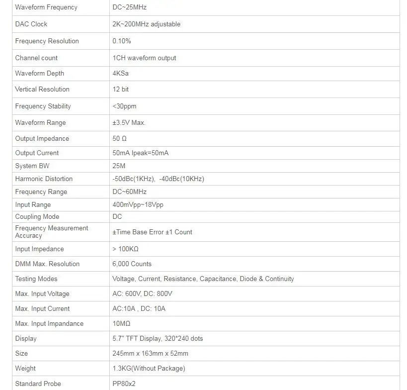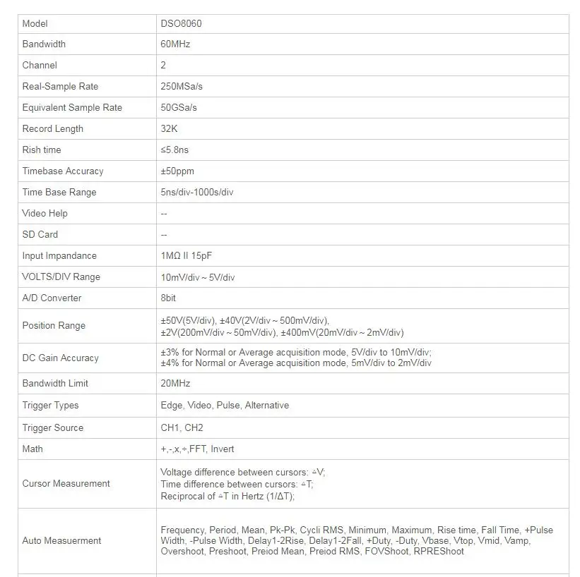 * DSO8060 портативный осциллограф пять в одном. Осциллограф/DMM/анализатор спектра/счетчик частоты/генератор сигналов Arbtrary. * Высокая пропускная способность 60 МГц осциллографа и 6000 отсчетов высокой точности DMM. Seperated GND Reference. Аппаратный счетчик частоты. * Генератор произвольной формы: 25Mz выход произвольной формы волны, (Синусоидальная волна может доставить до 75 Mz) 200 MSa/s DDS, 12 бит Вертикального разрешения. * FFT , + , - , * , / ,X-Y, 22 вида автоматических измерений, пройти/не проверить, проста в использовании на производственной линии. * Высокая частота обновления; Высокая частота образцов в реальном времени 150MSa/s-2GSa/s; 50GSa/s эквивалентная частота образцов. * Режим триггера Multiform, 2 отдельных временных базы в режиме триггера ALT, легко увидеть 2 сигнала с разной частотой. * 1000 сигналов сохраняет и записывает. * Отличный промышленный дизайн. Прямой ключ для каждого канала, временной базы, триггера и DMM, прост в эксплуатации. * Большой 5,7-дюймовый TFT цветной ЖК-дисплей, Светодиодный дисплей с четкой подсветкой. * USB хост/устройство 2,0 полноскоростной интерфейс, поддержка съемного диска, вариант локальной сети; Легко управлять ПК или на большое расстояние. * Работа от аккумулятора (устанавливается) промышленный дизайн. * Сохраните форму сигнала следующим образом: jpg/bmp графический файл, MS excel/word файл. * Размеры (мм):240(L)x165(W)x50(H), легко переносятся. * Labview \ VB \ VC второй экземпляр дизайна.