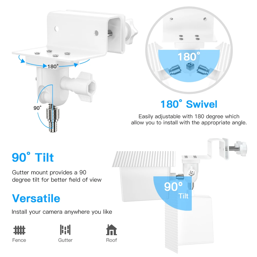【Любой Угол регулировки 】Крепление легко регулируется с поворотом на 180 градусов, что позволяет установить под соответствующим углом. Крепление желоба обеспечивает наклон 90 градусов для лучшего поля зрения.