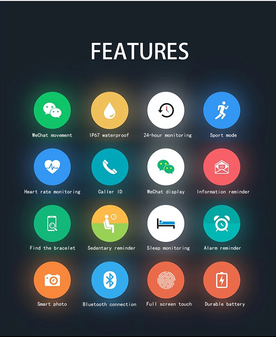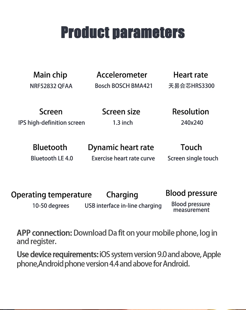 Требования: Android 4,4/iOS 9,0, выше Шагомер: пройденное расстояние, сжигаемые калории Монитор сна: обеспечивает время сна и качество сна Артериальное давление: определение кровяного давления Динамическая частота сердечных сокращений: пульсометр в процессе занятий спортом SpO2: обнаружение SpO2 Отслеживание цели: вибрирует и мигает, чтобы отметить Сигнализация: 3 будильника Звонок отклонен: Нажмите и удерживайте браслет, чтобы повесить телефон Тренировка: ходьба, бег, езда на велосипеде, скакалка, бадминтон, баскетбол, футбол, плавание Напоминание: имя входящего звонка Поддержка уведомлений: Wechat QQ, Facebook, Twitter, WhatsApp, Skype, Instagram и так далее Управление камерой: Поддержка оригинальной камеры iOS, встроенное приложение для Android. Домашние скины: 3 скины на мобильный телефон OTA Upgrad: обновление прошивки через приложение Языки: Прошивка: английский, китайский, корейский, испанский, японский, французский, немецкий, русский, Арабская, Украинская Приложение: английский, китайский простой, китайский традиционный, английский, немецкий, испанский, японский, французский, итальянский, русский, Арабская, португальский, Украинская MCU: NRF52832 QFAA Датчик ускорения: BOSCH Дисплей: экран Размер: 1,3 дюйма Разрешение: 240x240 Интерактивный режим: сенсорный экран Bluetooth:Bluetooth LE 4,0