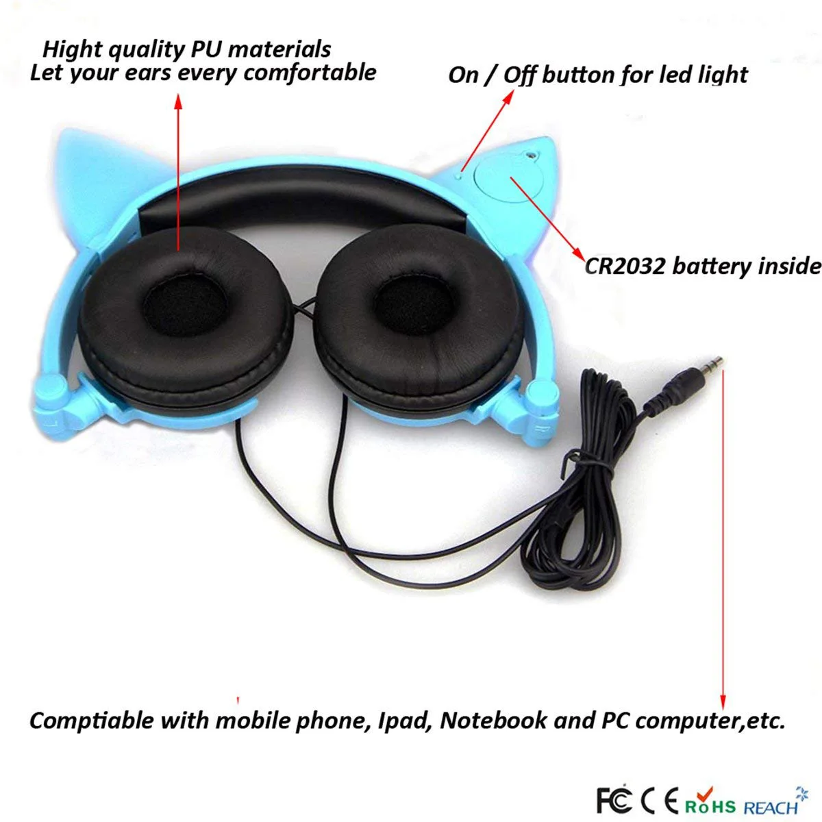 Тип: креативные наушники с кошачьими ушками Светодиодный светильник-вспышка Светильник: синий/розовый -Cotinious светодиодный режим вспышки: 18-20 часов Материал: ABS чехол + PU Размер: около 190*190*74 мм (мин) Стиль: повязка на голову Он-лайн Длина: 1,5 м -Сопротивление: 32 Связь: Проводная Тип вилки: линейный тип -Разъемы: 3,5 мм -Микрофон: Нет Аккумулятор: 1 * Аккумулятор CR2032 -Диапазон частотной реакции: 20-2000 Гц