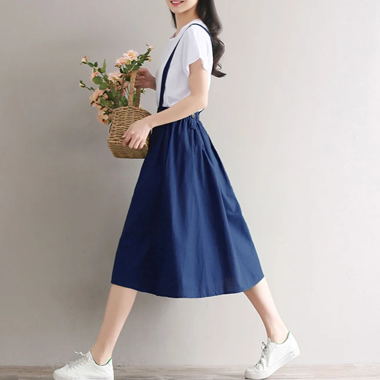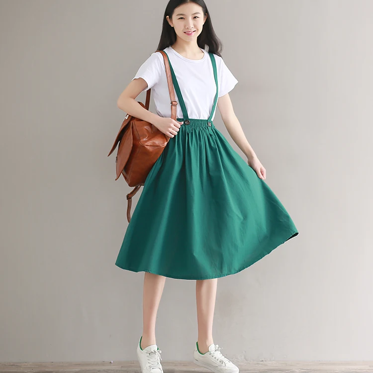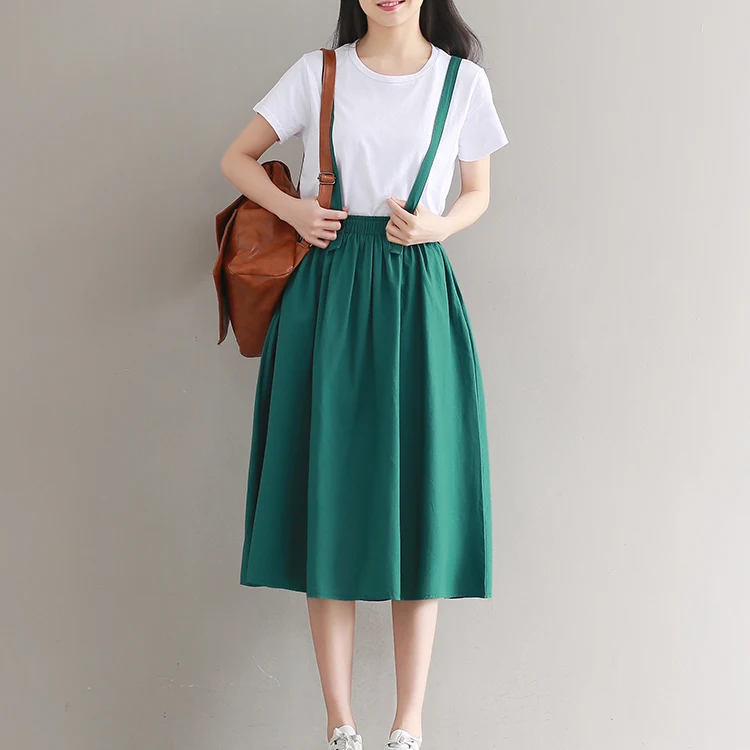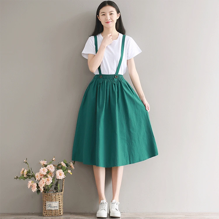 Japanese Mori Girl Skirt Pure Color Midi Saia Women High Waist Cotton and Linen Long Skirts Navy Blue,Green