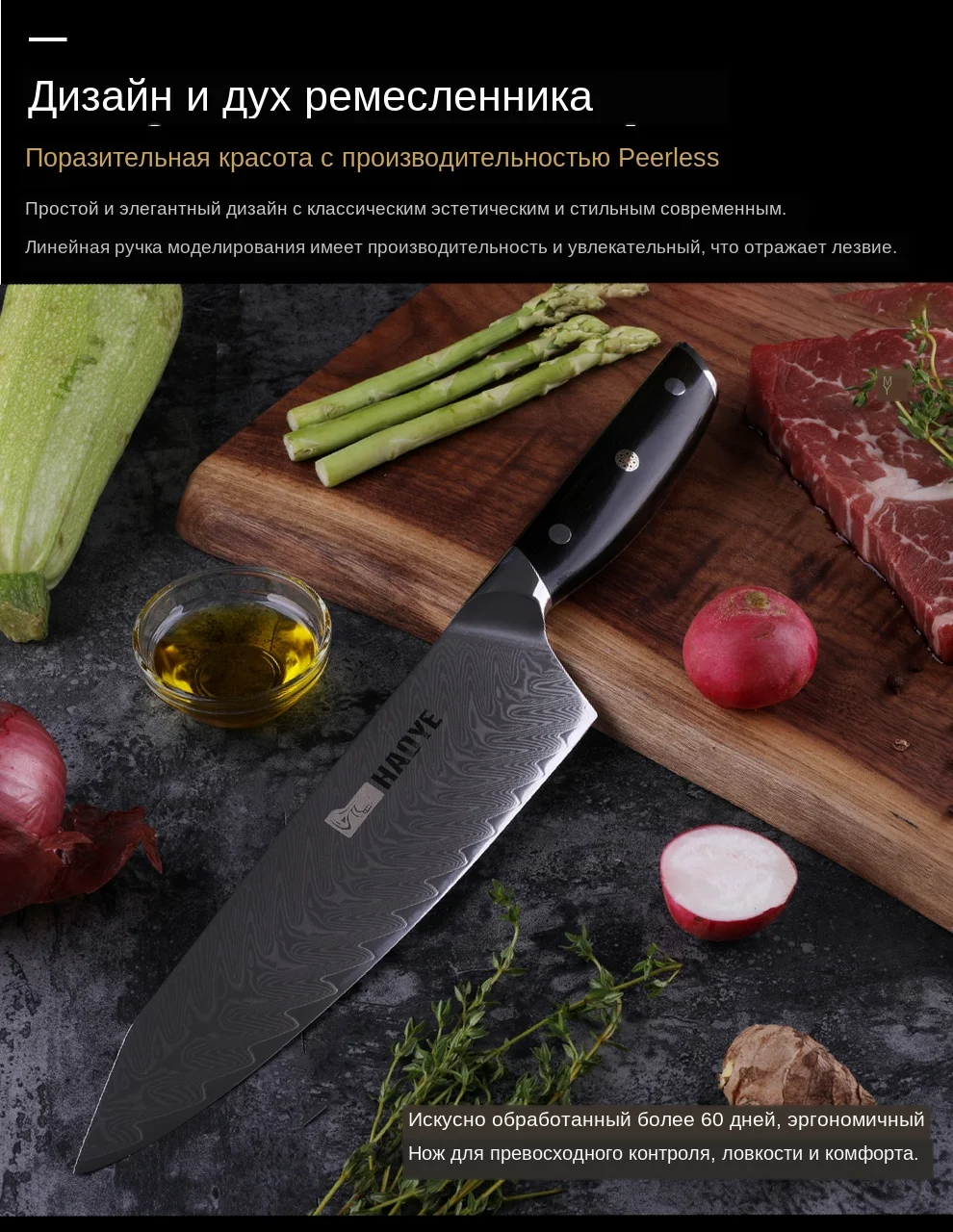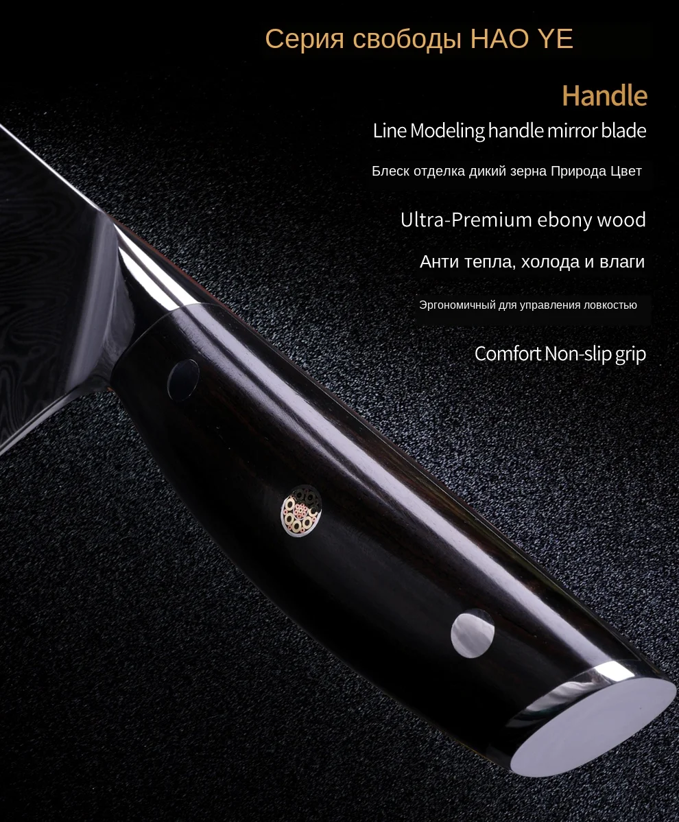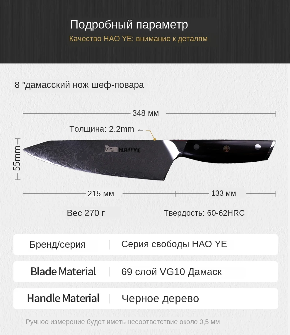 Лезвие 1) Как остроконечная кухонная электростанция, так и художественное оформление в премиальном дизайне и мастерстве. 2) бритвенный острый угол резки 9-12 ° для гладкого среза. 3) невероятное удержание края на 60-62 Rockwell. Режьте дольше, двигайтесь вперед. 4) VG10 супер стальной сердечник. Конечная сталь для максимальной производительности. 5) 69-многослойное платье из дамасской стали ЗАТОЧЕННЫЕ под старинный меч метод производства и микроскопическая технологии. 6) Антикоррозийная облицовка означает, что ваш нож будет чище и прослужит дольше. 7) Haoye Freedom серия дамасский дракон кости лезвие шаблон, для ударов, выделяются красоты. 8) изысканный молоток придаст красоту мастерству, уменьшая сопротивление и минимизируя прилипание на еде. 9) длина лезвия 215 мм ширина лезвия 55 мм позволяет улучшить зазор костяшек. Легко Налейте еду на лезвие. 10) конический валик обеспечивает правильный баланс и защиту пальцев и удобный захват.