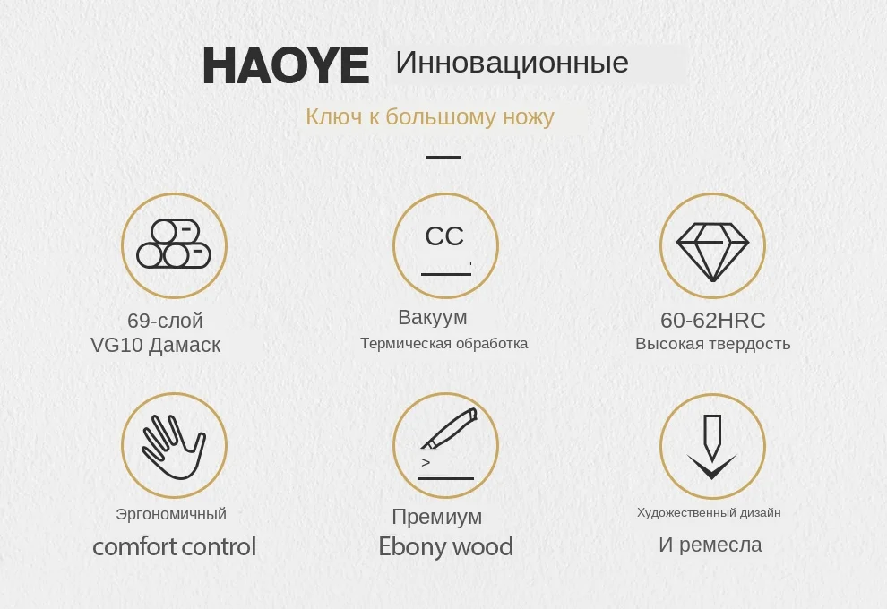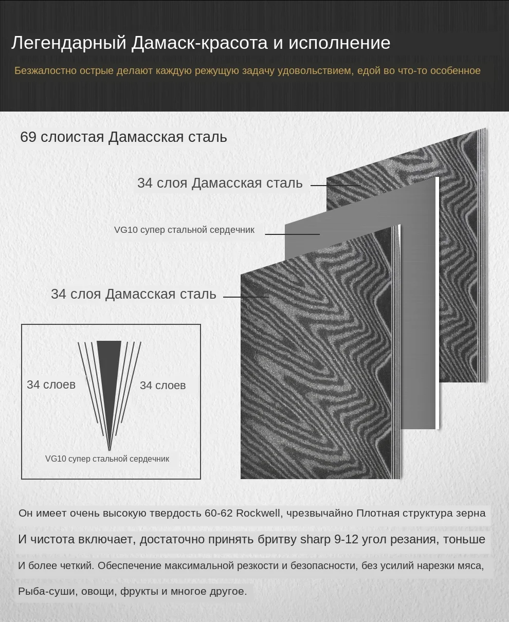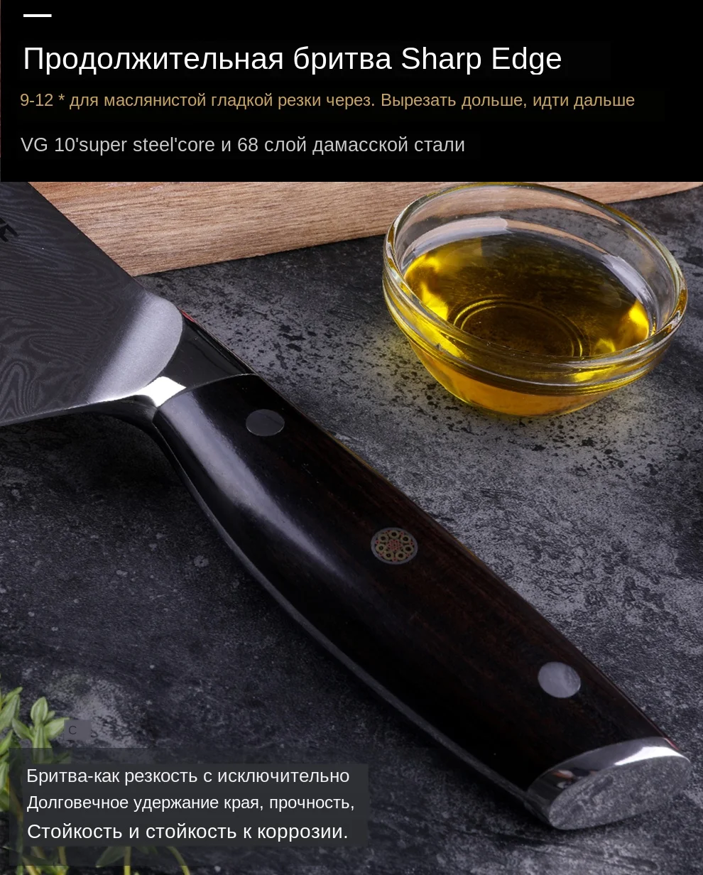 Лезвие 1) Как остроконечная кухонная электростанция, так и художественное оформление в премиальном дизайне и мастерстве. 2) бритвенный острый угол резки 9-12 ° для гладкого среза. 3) невероятное удержание края на 60-62 Rockwell. Режьте дольше, двигайтесь вперед. 4) VG10 супер стальной сердечник. Конечная сталь для максимальной производительности. 5) 69-многослойное платье из дамасской стали ЗАТОЧЕННЫЕ под старинный меч метод производства и микроскопическая технологии. 6) Антикоррозийная облицовка означает, что ваш нож будет чище и прослужит дольше. 7) Haoye Freedom серия дамасский дракон кости лезвие шаблон, для ударов, выделяются красоты. 8) изысканный молоток придаст красоту мастерству, уменьшая сопротивление и минимизируя прилипание на еде. 9) длина лезвия 215 мм ширина лезвия 55 мм позволяет улучшить зазор костяшек. Легко Налейте еду на лезвие. 10) конический валик обеспечивает правильный баланс и защиту пальцев и удобный захват.