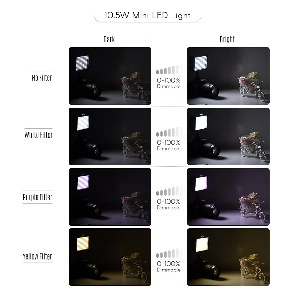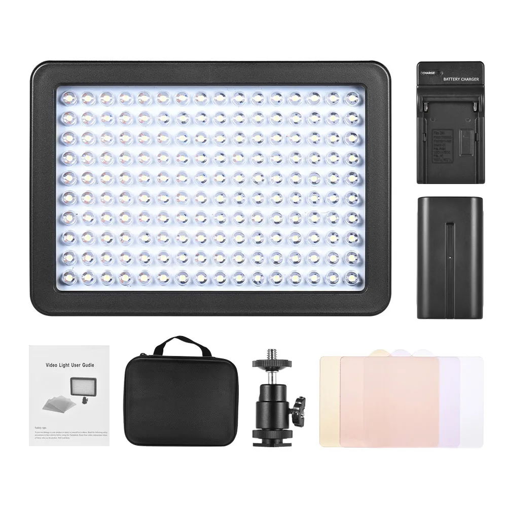 Светодиодный светильник Andoer включает в себя мини-светодиодный светильник + аккумулятор 4400 мАч F750 + зарядное устройство + 3 цветных фильтра + адаптер + сумка для переноски. В светильник имеет 160 шт. высокого качества светодиодный бусы и выдает 10,5 Вт высокой мощности, 0-100% затемнения. Вы можете вставить фильтры, чтобы создать различные эффекты на светильник.