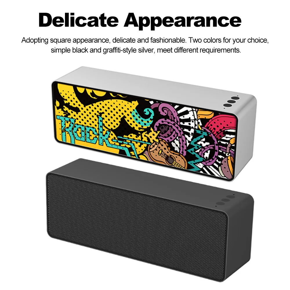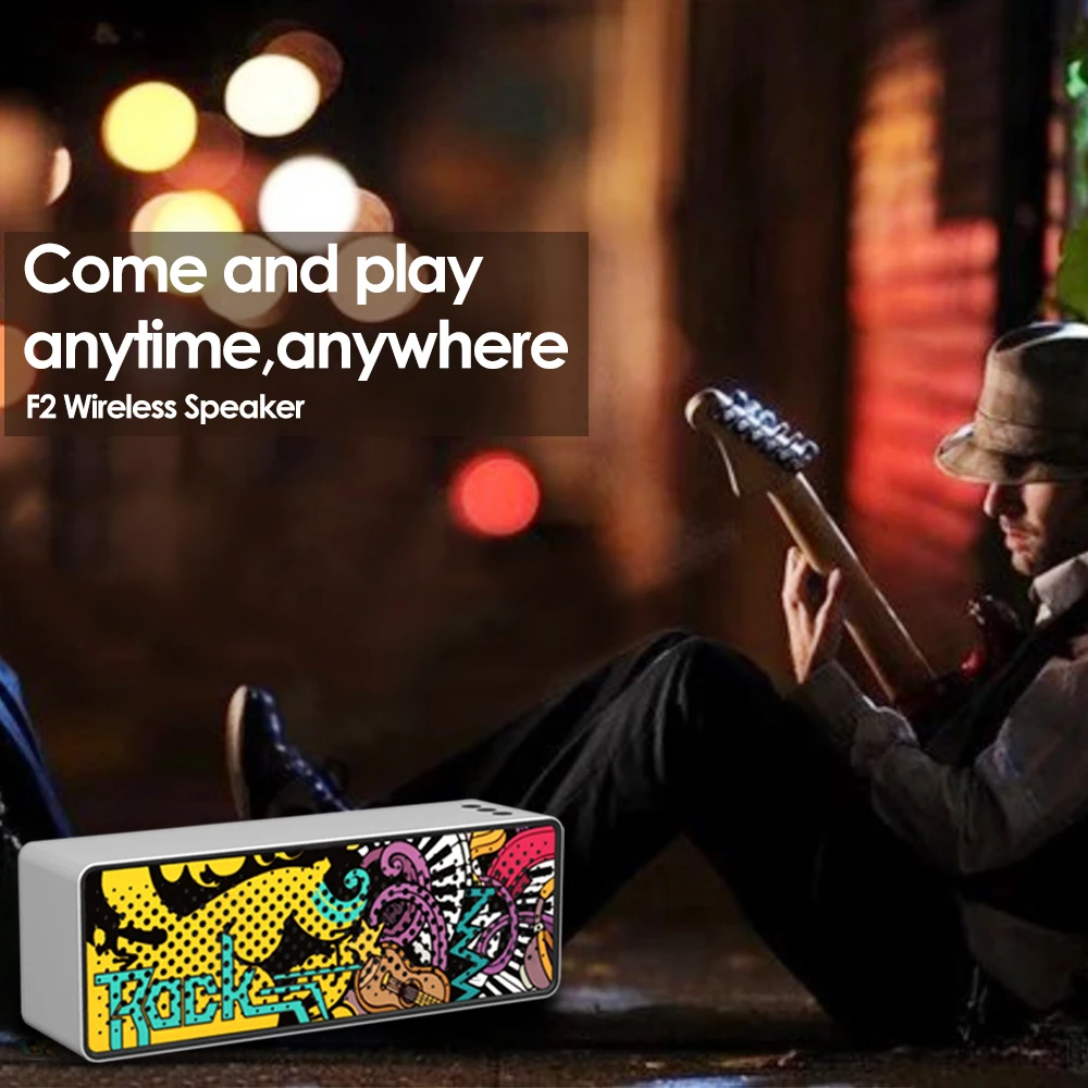 Беспроводной динамик F2 BT имеет квадратный внешний вид, деликатный и модный. БТ 4,2 tenchnology обеспечивает более стабильную передачу и расстояние передачи может быть до 10 метров. Он совместим практически со всеми устройствами с поддержкой BT. С двумя динамиками 5 Вт и одной диафрагмой, вы можете наслаждаться высоким качеством и стереозвуком, чтобы погрузиться в мир музыки. Встроенный литиевый аккумулятор 2000 мАч обеспечивает около 5 часов работы. Для полной зарядки потребуется 2-3 часа, просто подключите usb-кабель к динамикам и Подключите зарядное устройство 5 В или компьютер для зарядки динамика. Кроме того, динамик поддерживает различные режимы воспроизведения, такие как режим BT, режим U disk, режим tf-карты и режим AUX, Наслаждайтесь музыкой в любое время и в любом месте. Два цвета на ваш выбор, простой черный и серебряный в стиле граффити, отвечают различным требованиям.