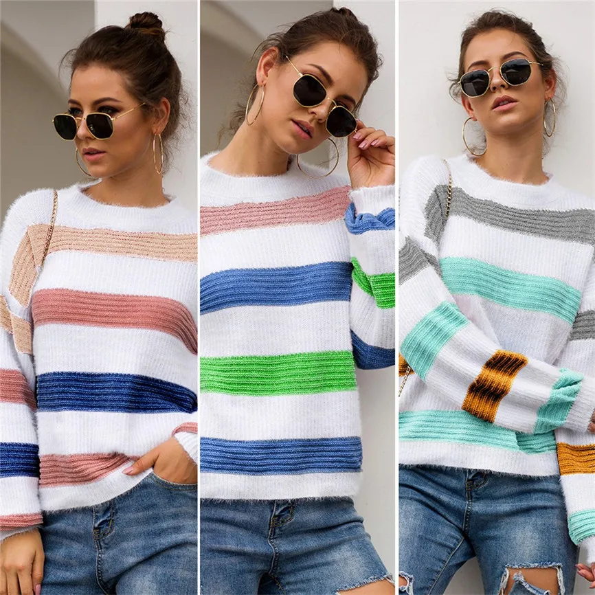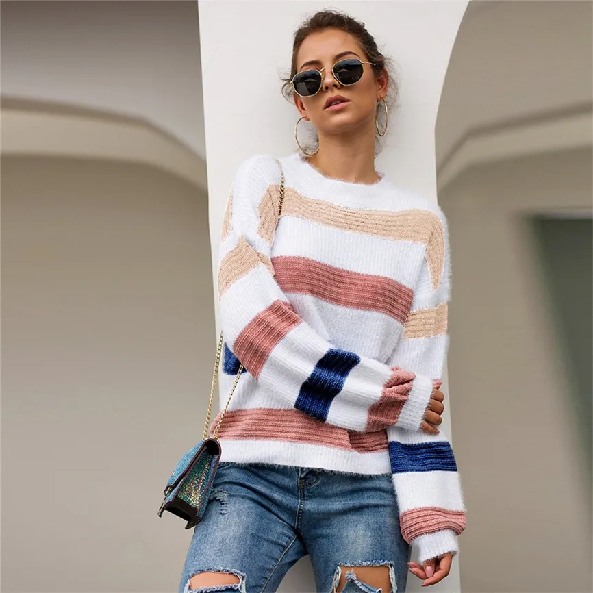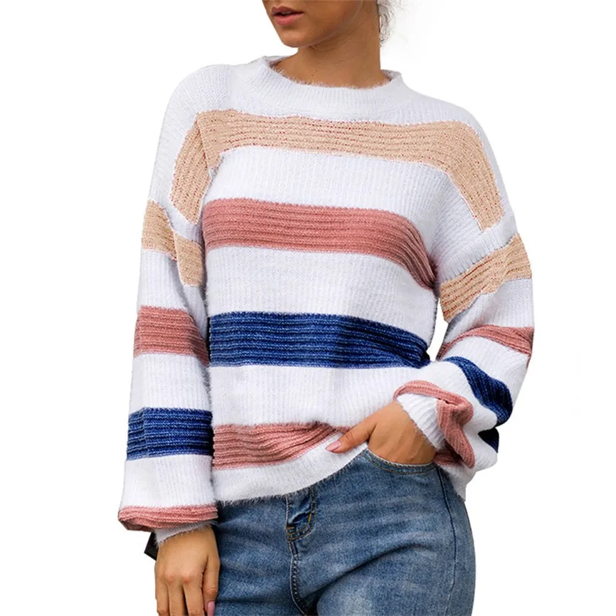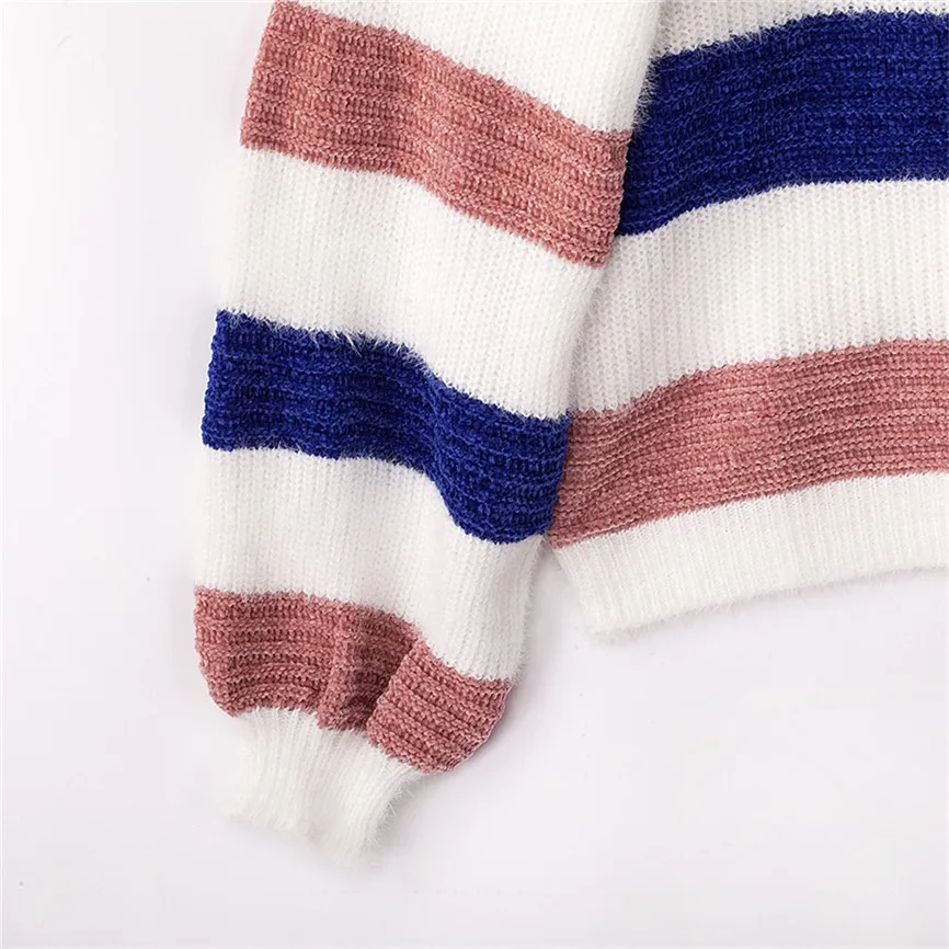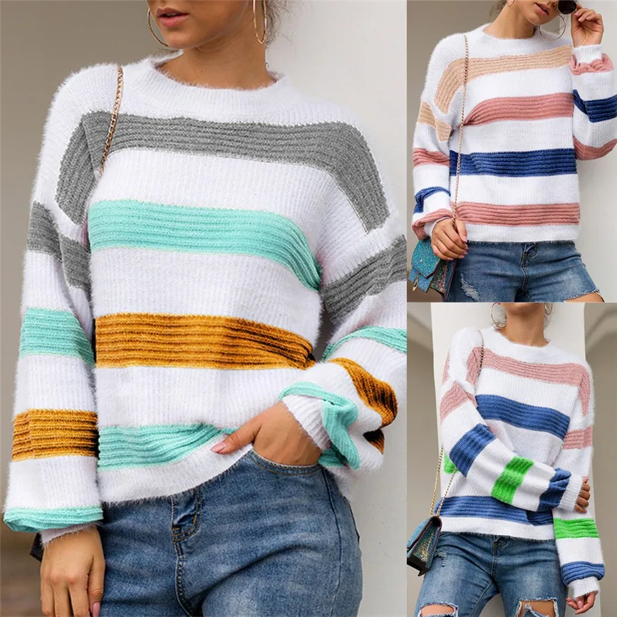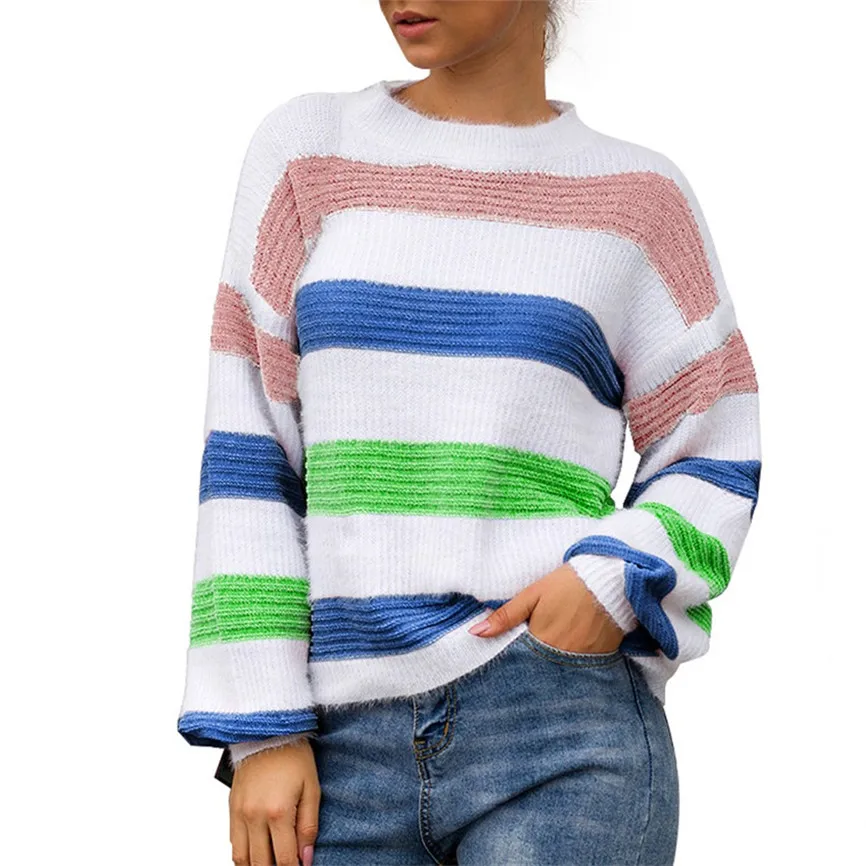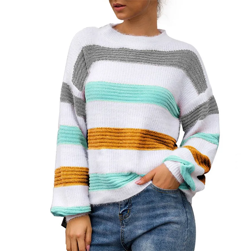 Женские свитера, пуловеры размера плюс, женские вязаные полосатые Лоскутные Свитера с длинным рукавом и круглым вырезом, женские свитера Invierno 2019