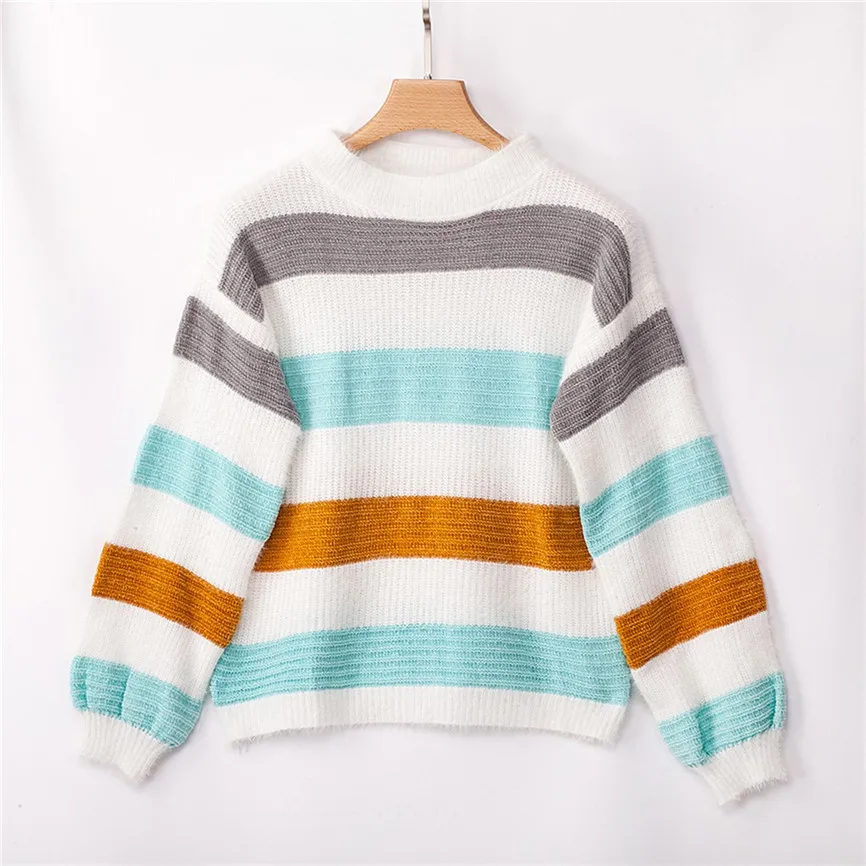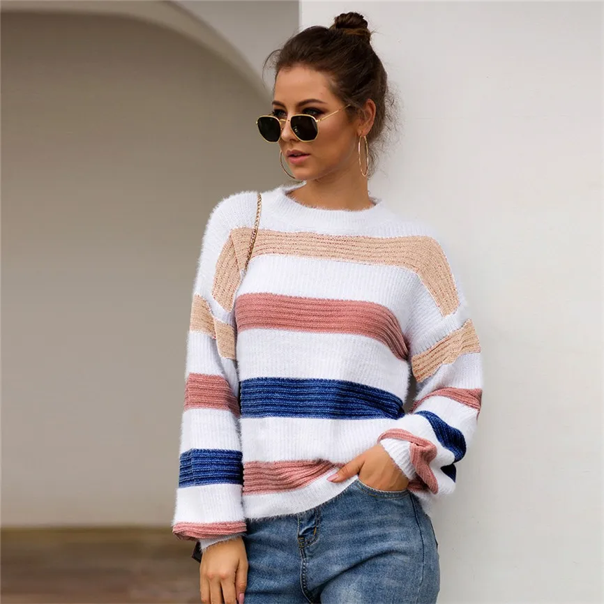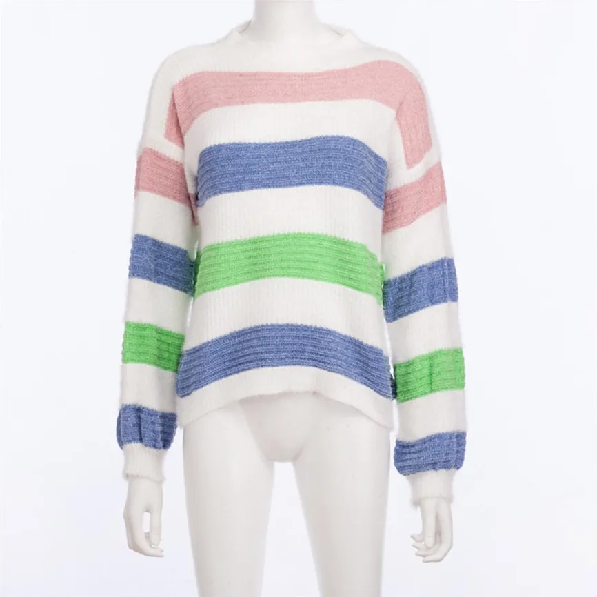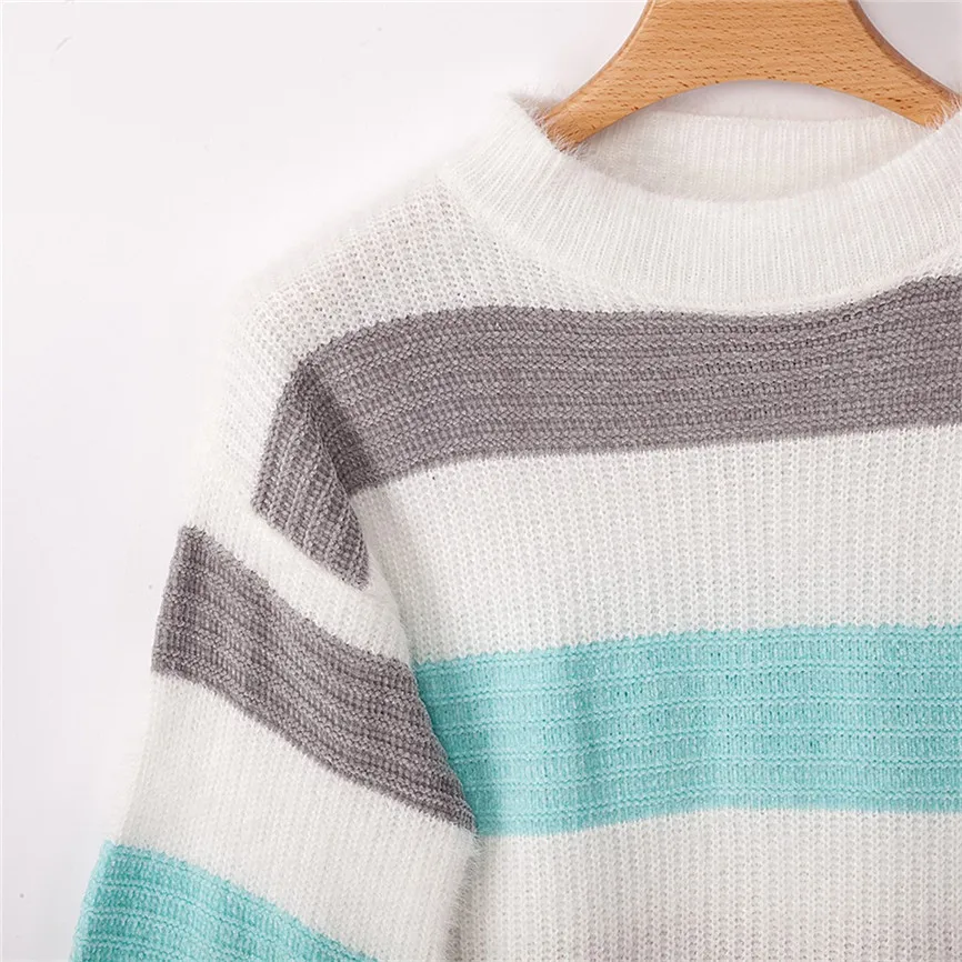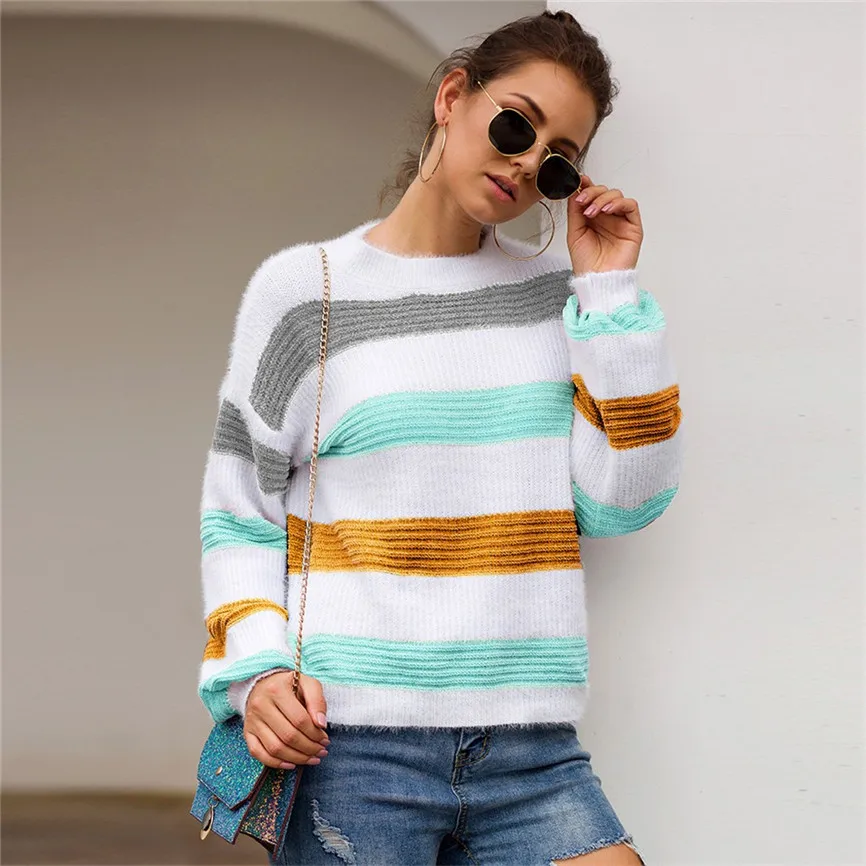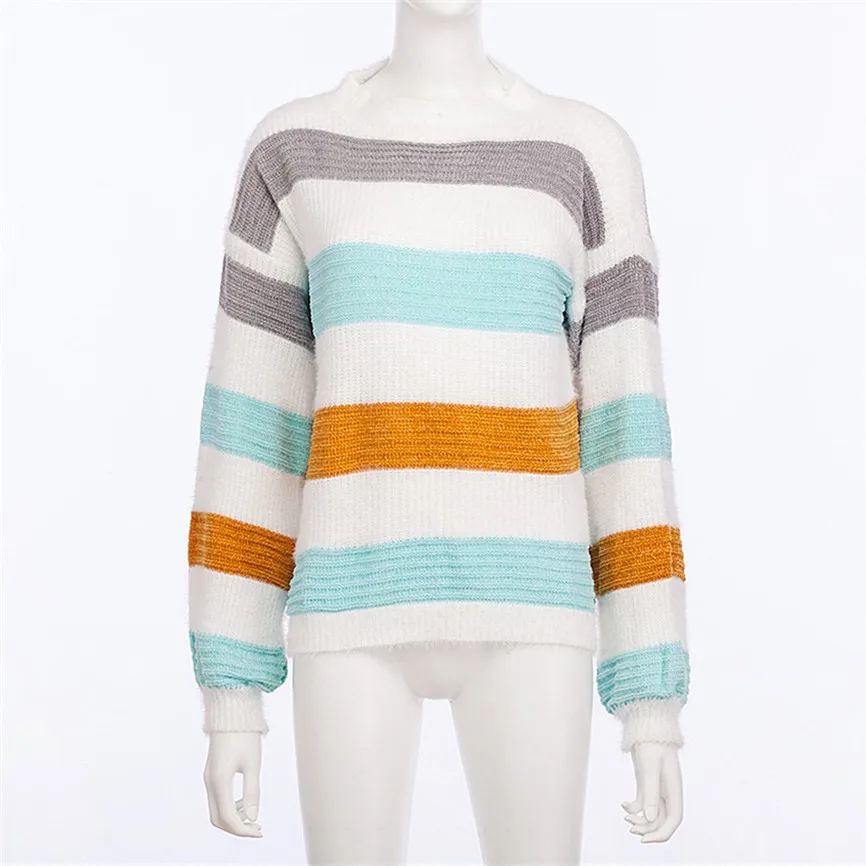 Женские свитера, пуловеры размера плюс, женские вязаные полосатые Лоскутные Свитера с длинным рукавом и круглым вырезом, женские свитера Invierno 2019