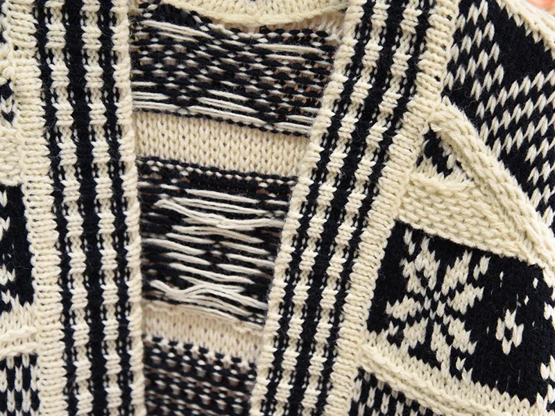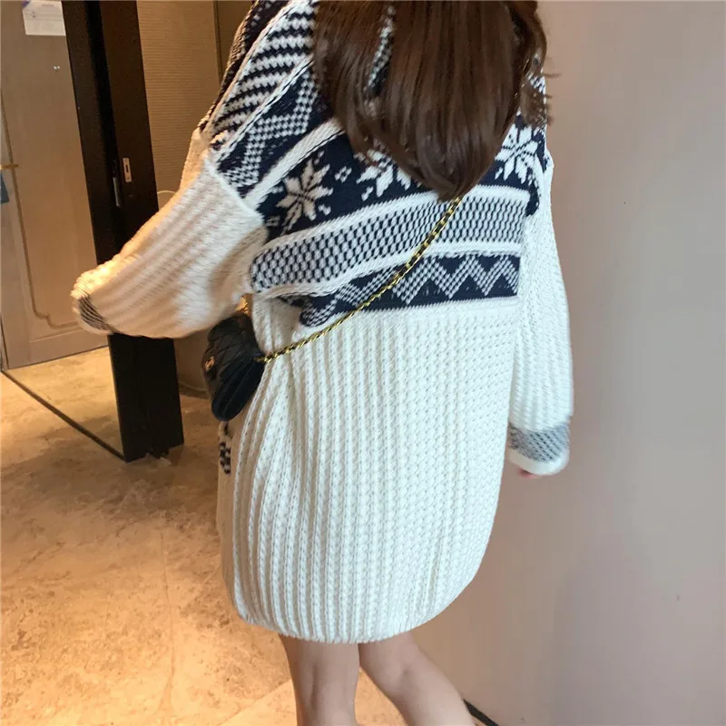 Brand Designer Vintage 2019 New Snowflake Striped Knitted Flower Long Cardigan Sweater Women Coat V-neck Long Sleeve Clothing