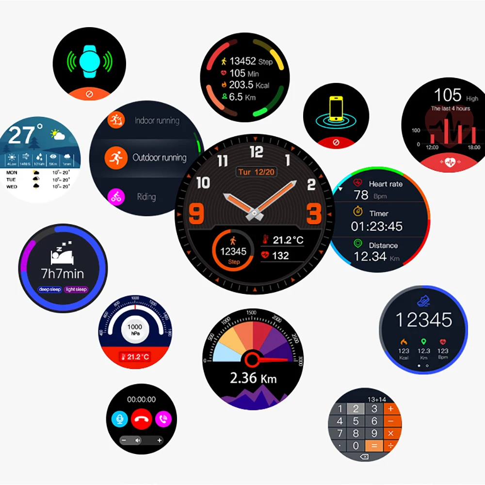 Функции: компас, датчик давления, геомагнитный, гироскоп, громкоговоритель, калории, шаги, расстояние, бег, частота сердечных сокращений, мониторинг сна, напоминание о звонках/сообщениях, напоминание о сидячем положении, push сообщений, уведомления в социальных сетях, управление камерой, музыка, анти-потеря, погода в реальном времени, будильник,