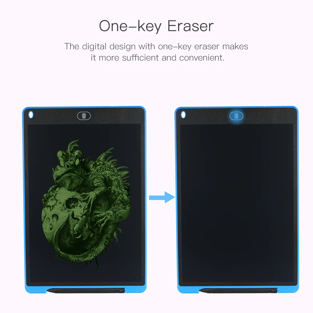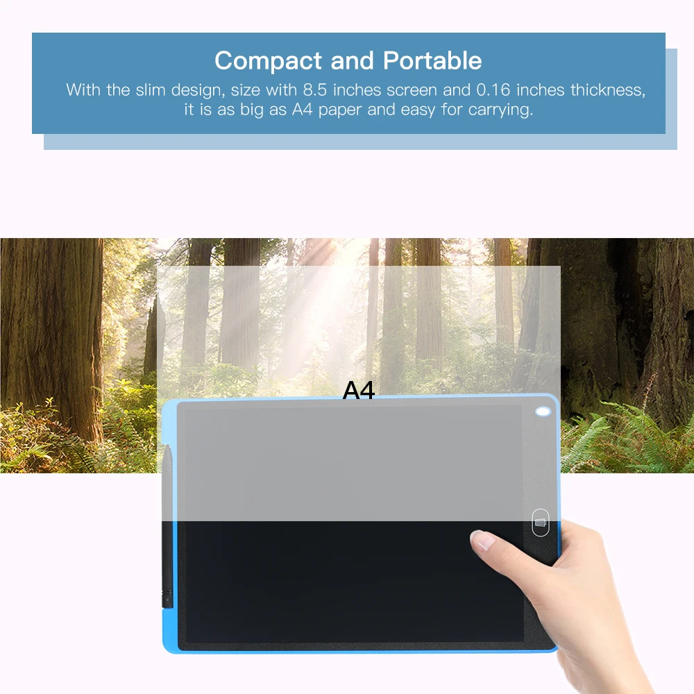 Прочный и портативный: тонкий дизайн, размер с экраном 12 дюймов и толщиной 0,16 дюймов, он такой же большой, как бумага формата А4 и прост в переноске. И его можно повторно использовать в течение нескольких раз с батареей CR2020, водой и ударопрочностью.