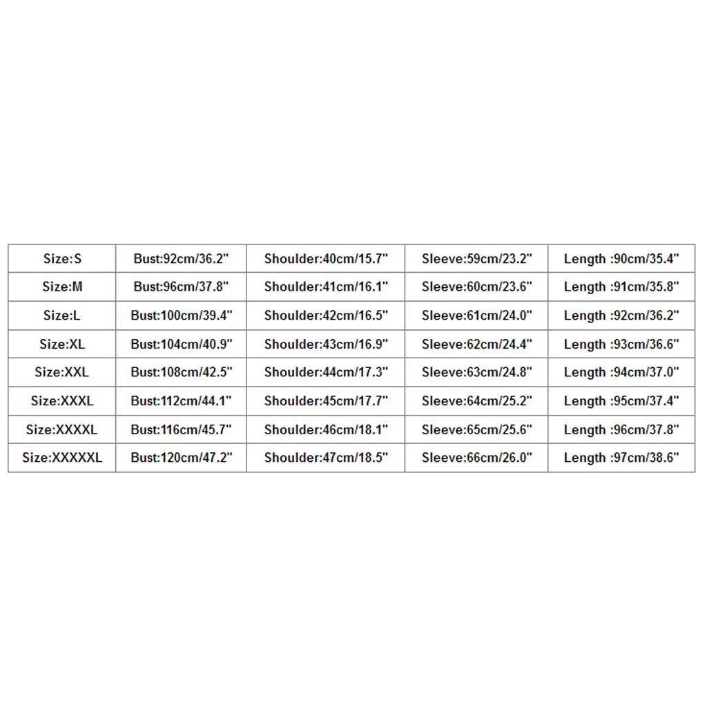 | Размеры: XXXXXL | Обхват груди: 120 см/47,2" | Плечо: 47 см/18,5 дюйма | Рукав: 66 см/26,0 дюйма | Длина: 97 см/38,6 дюйма |