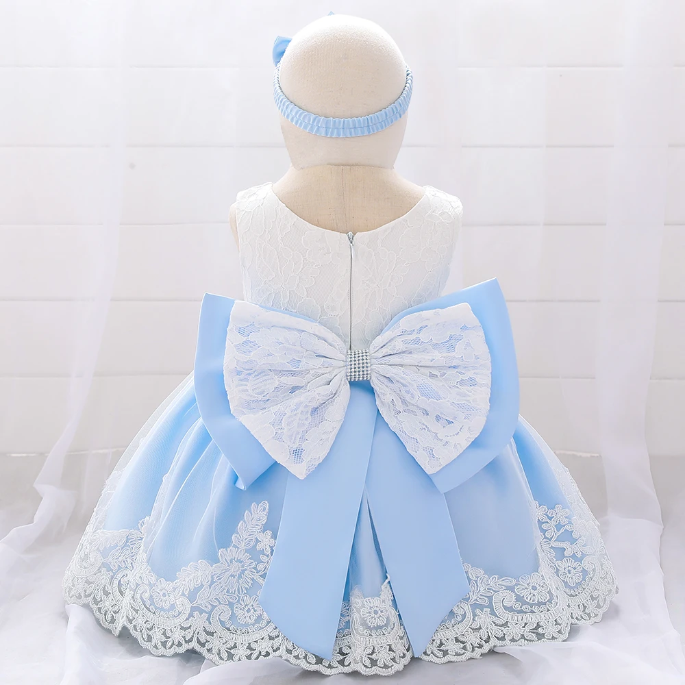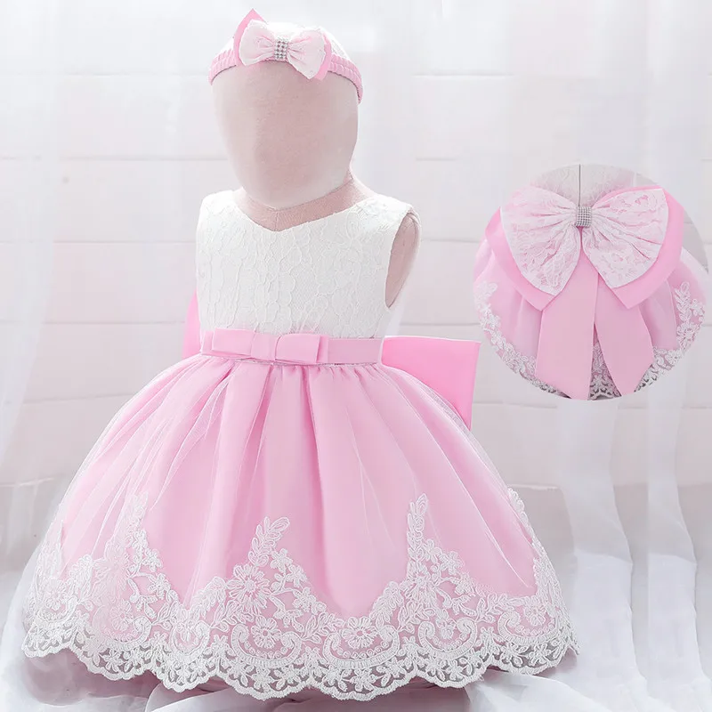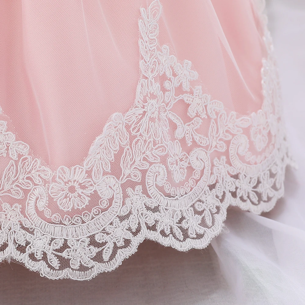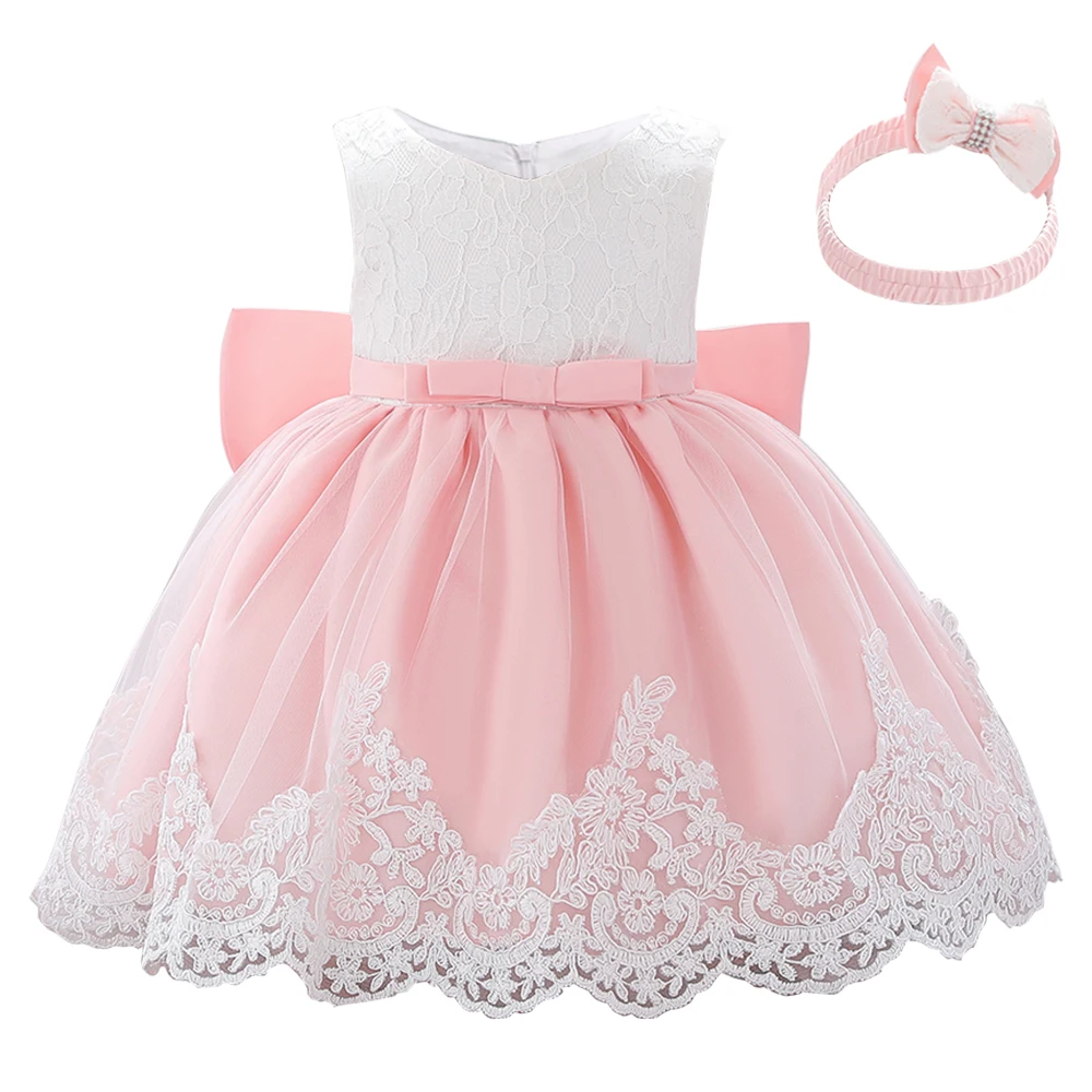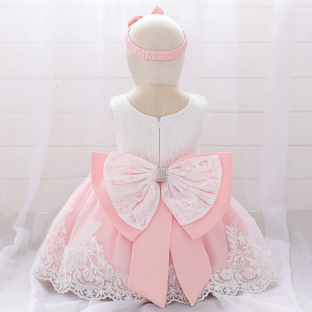 Детское кружевное платье с большим бантом, розовое платье для крещения для девочек 1 года, платье для дня рождения и свадьбы, лето 2019